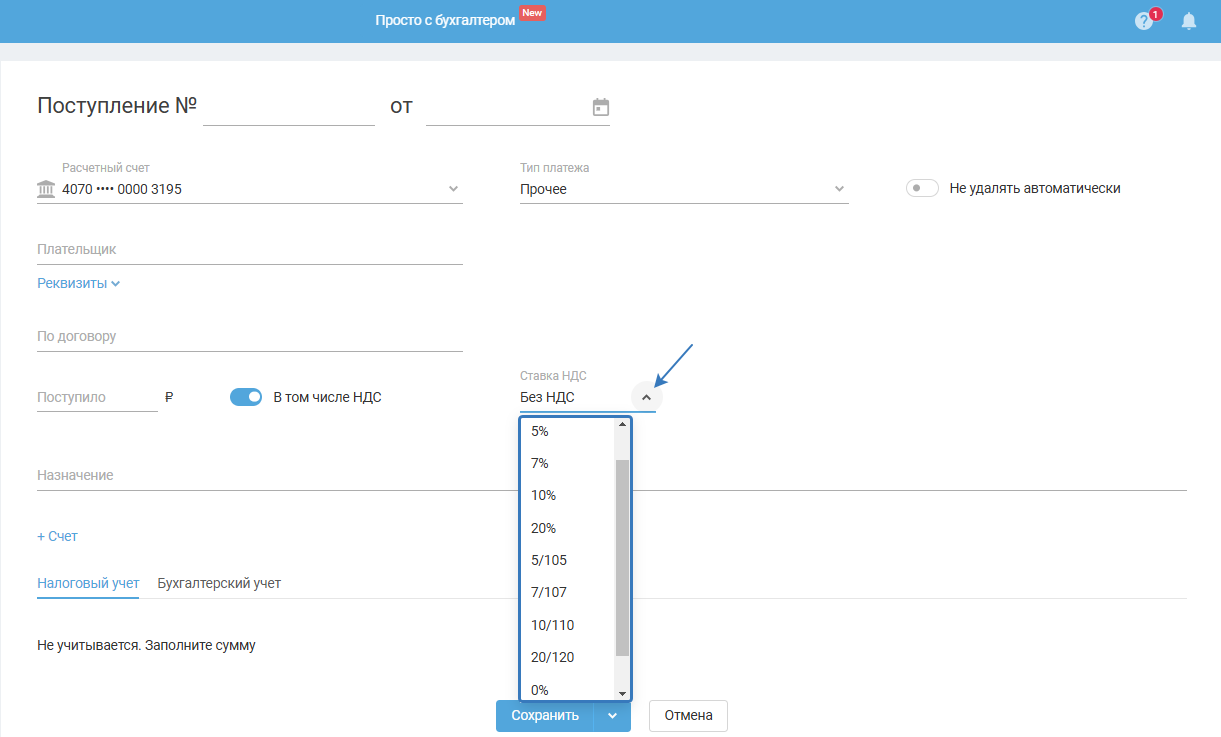 – В том числе НДС. Если в составе суммы перечисляется в т.ч. НДС, необходимо указать это в соответствующем поле.