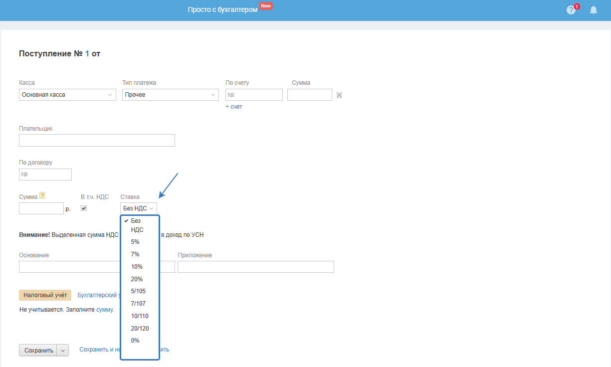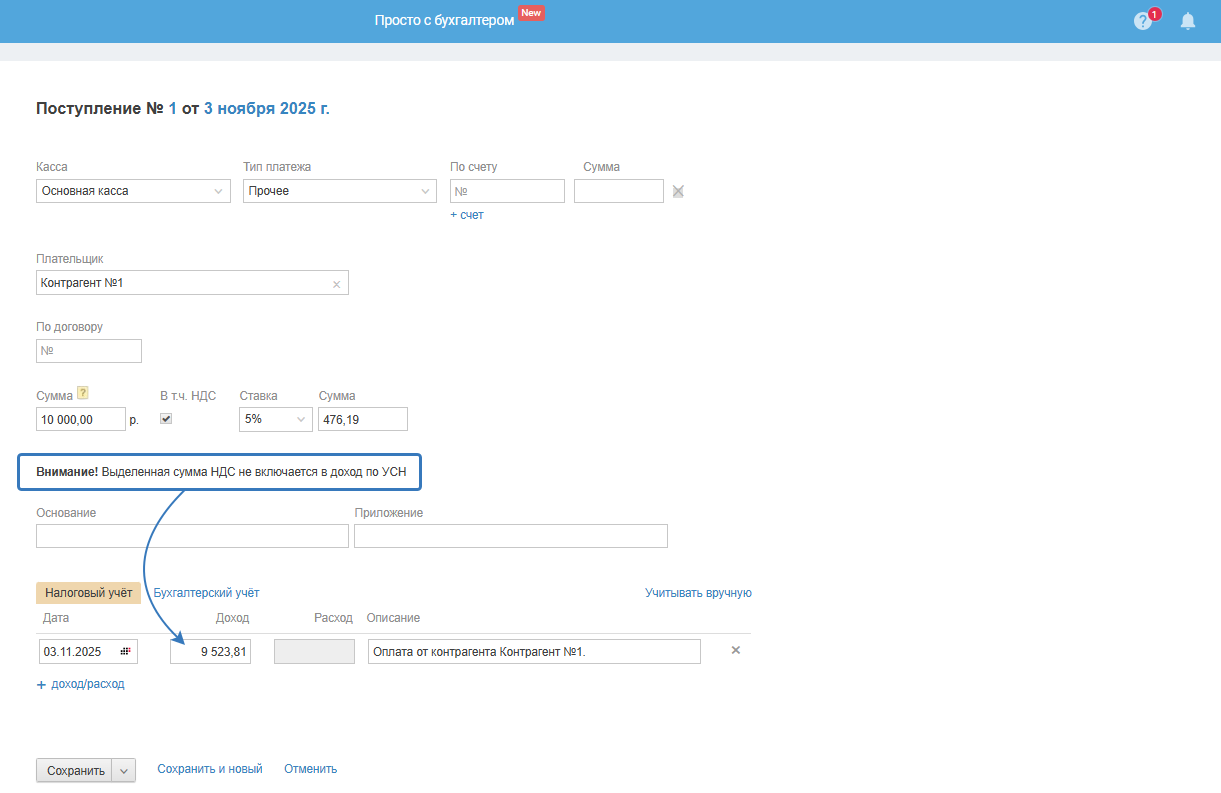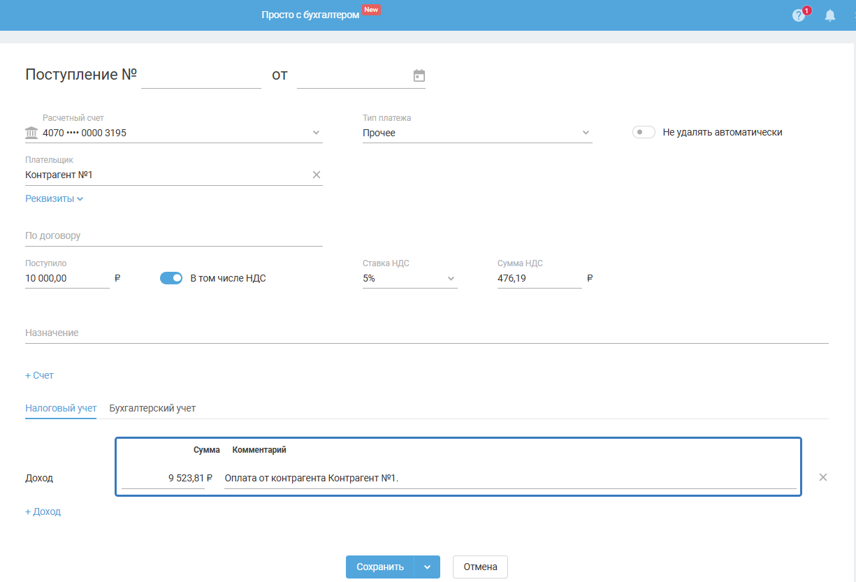 Укажите сумму дохода для целей налогообложения за минусом суммы, выделенной по НДС, и заполните поле «Комментарий», который будет отображаться в графе «содержание операции» в КУДиР.
