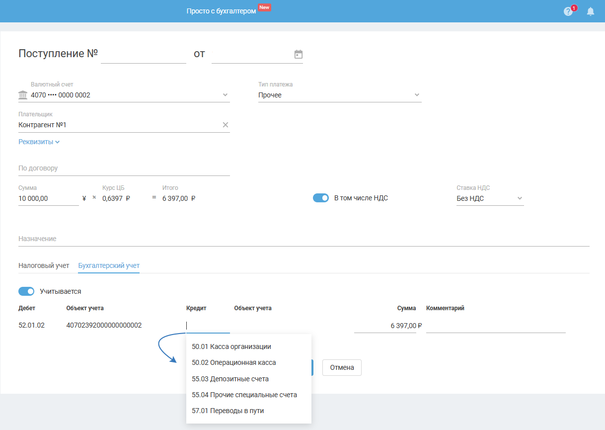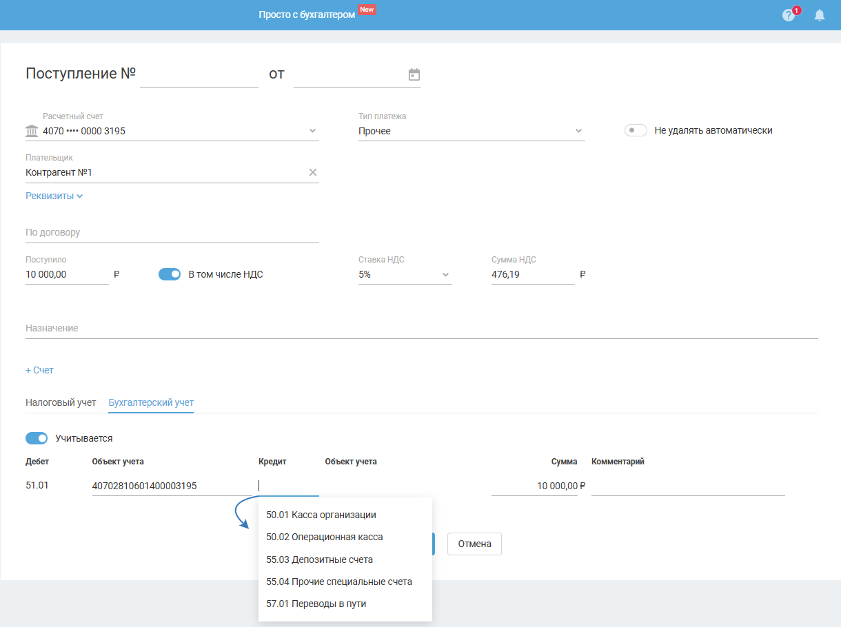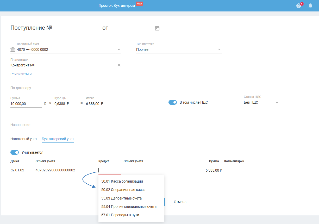 2) В блоке «Бухгалтерский учёт» заполните самостоятельно счёт в поле «Кредит» и поле «Комментарий».
