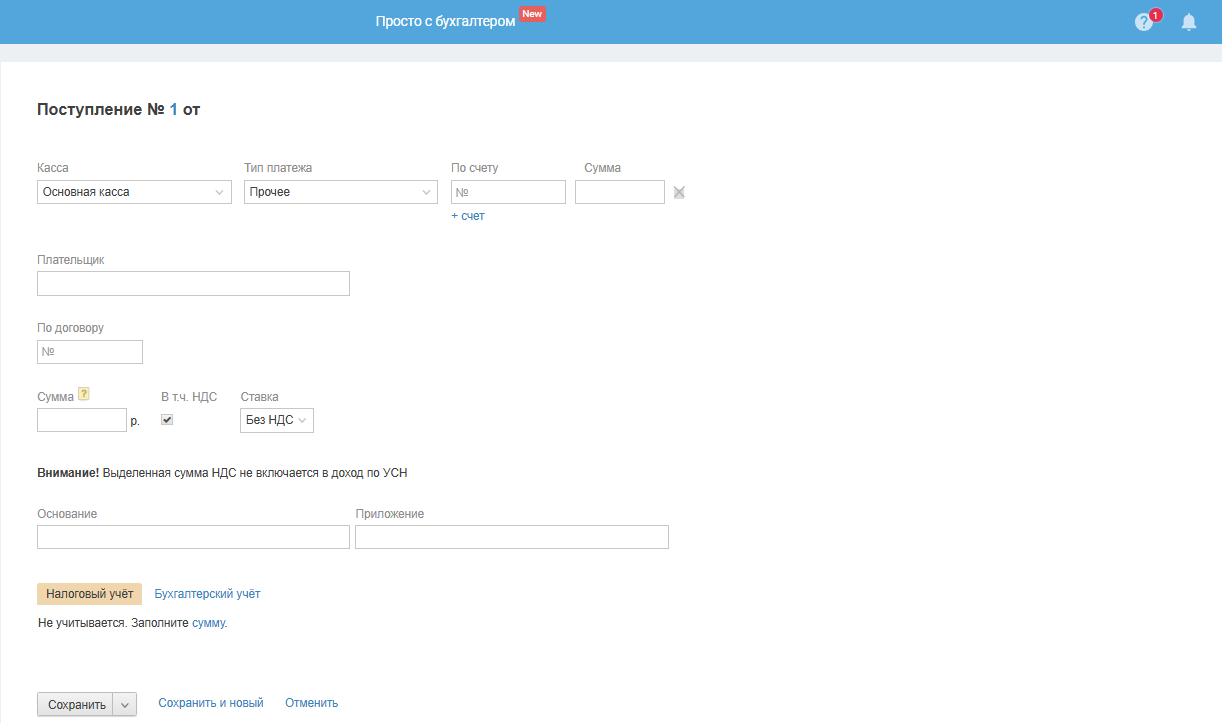 - приходный кассовый ордер с типом «Прочий платеж» (при поступлении наличных денежных средств).