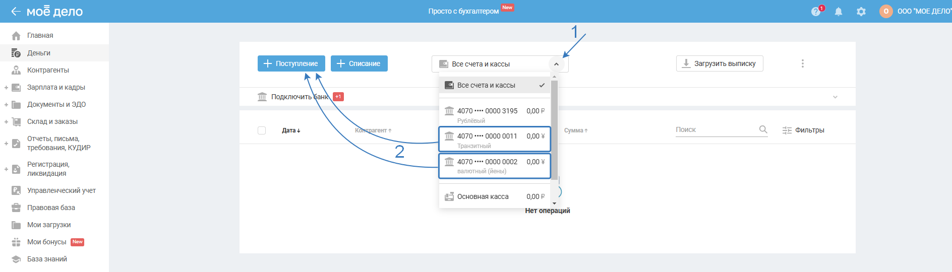 В разделе «Деньги» нажмите на поле «Все счета и кассы» и выберите из выпадающего списка валютный расчётный или транзитный счёт, на который происходит поступление денежных средств от клиента: