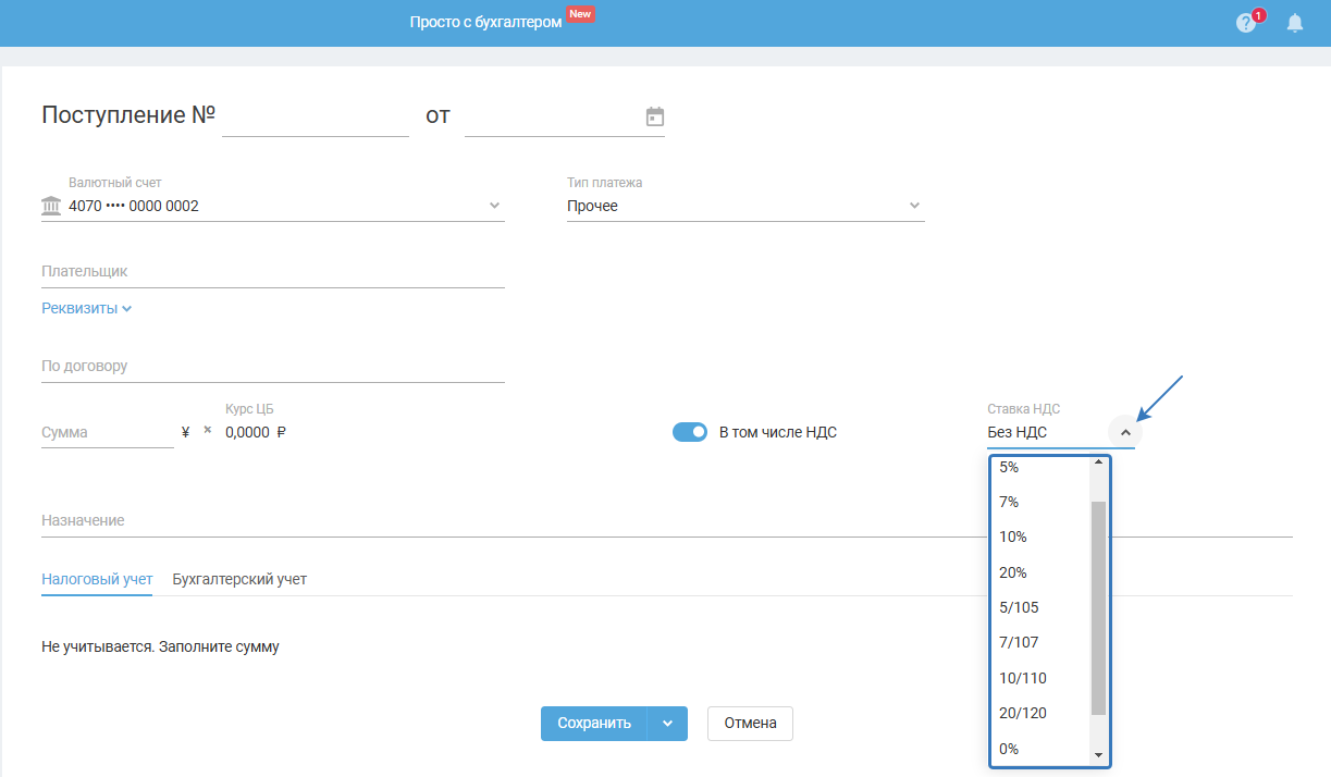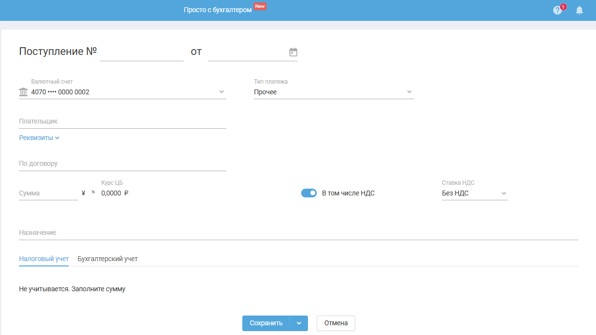 1) В зависимости от того, облагаются налогом или нет поступившие средства на валютный счёт, заполните самостоятельно в блоке «Налоговый учёт» графы «Сумма» и «Комментарий», если полученные средства не облагаются налогом, тогда оставьте строку пустой.