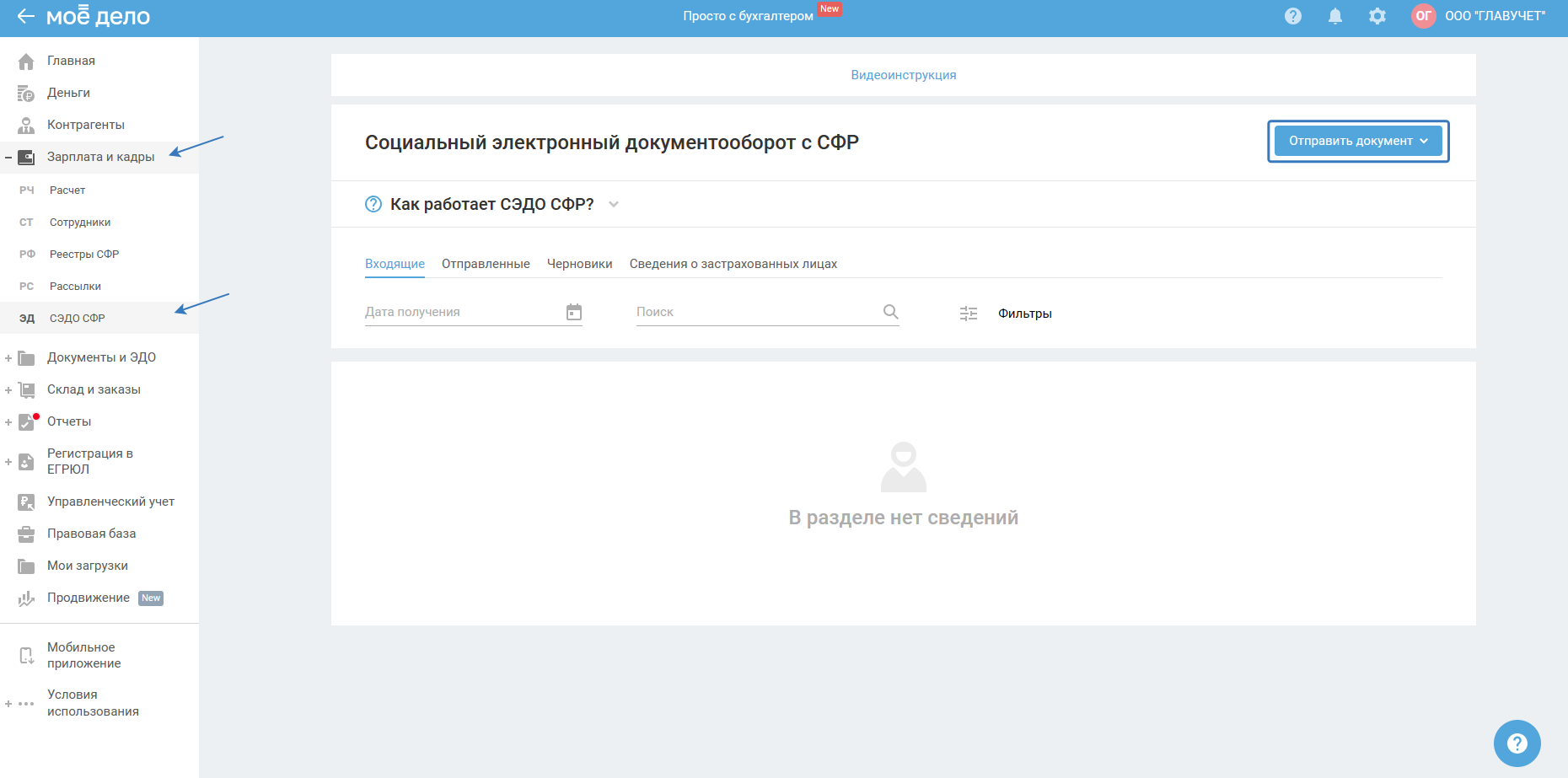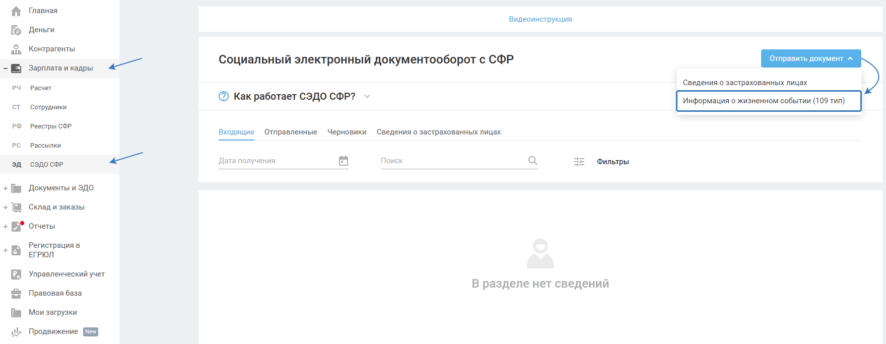 В разделе СЭДО СФР с помощью кнопки «Отправить документ» вы сможете сформировать и отправить документы в СФР: