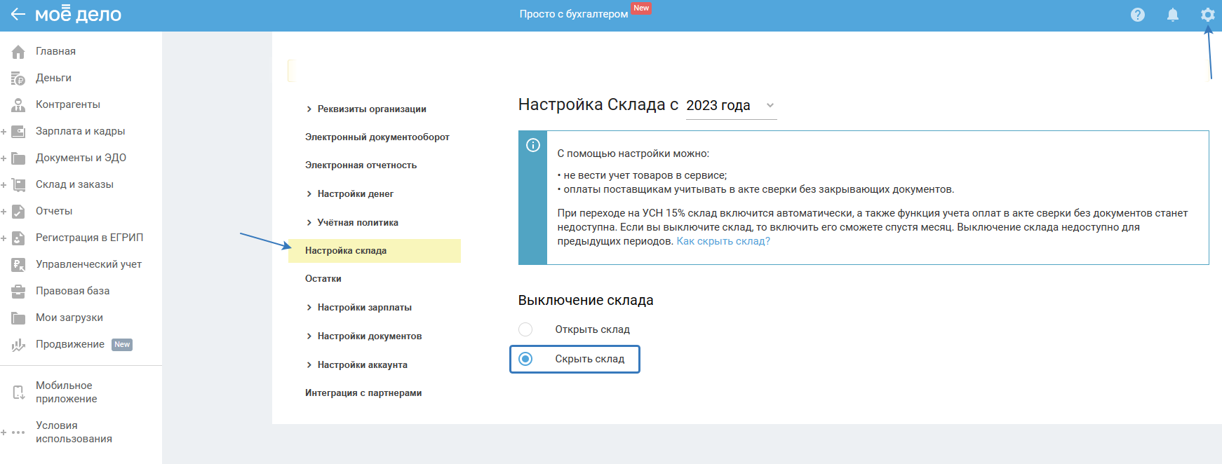Стало доступно скрытие склада для ИП на УСН 6%, УСН 6% + ПСН: