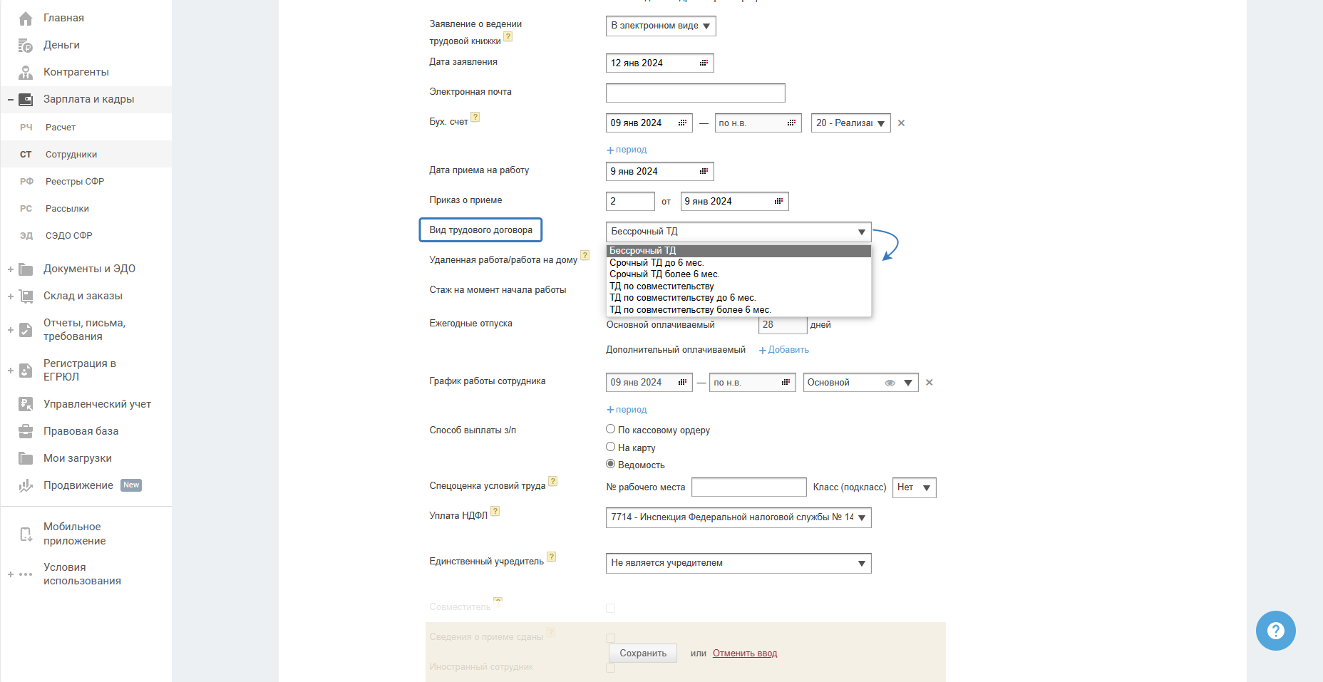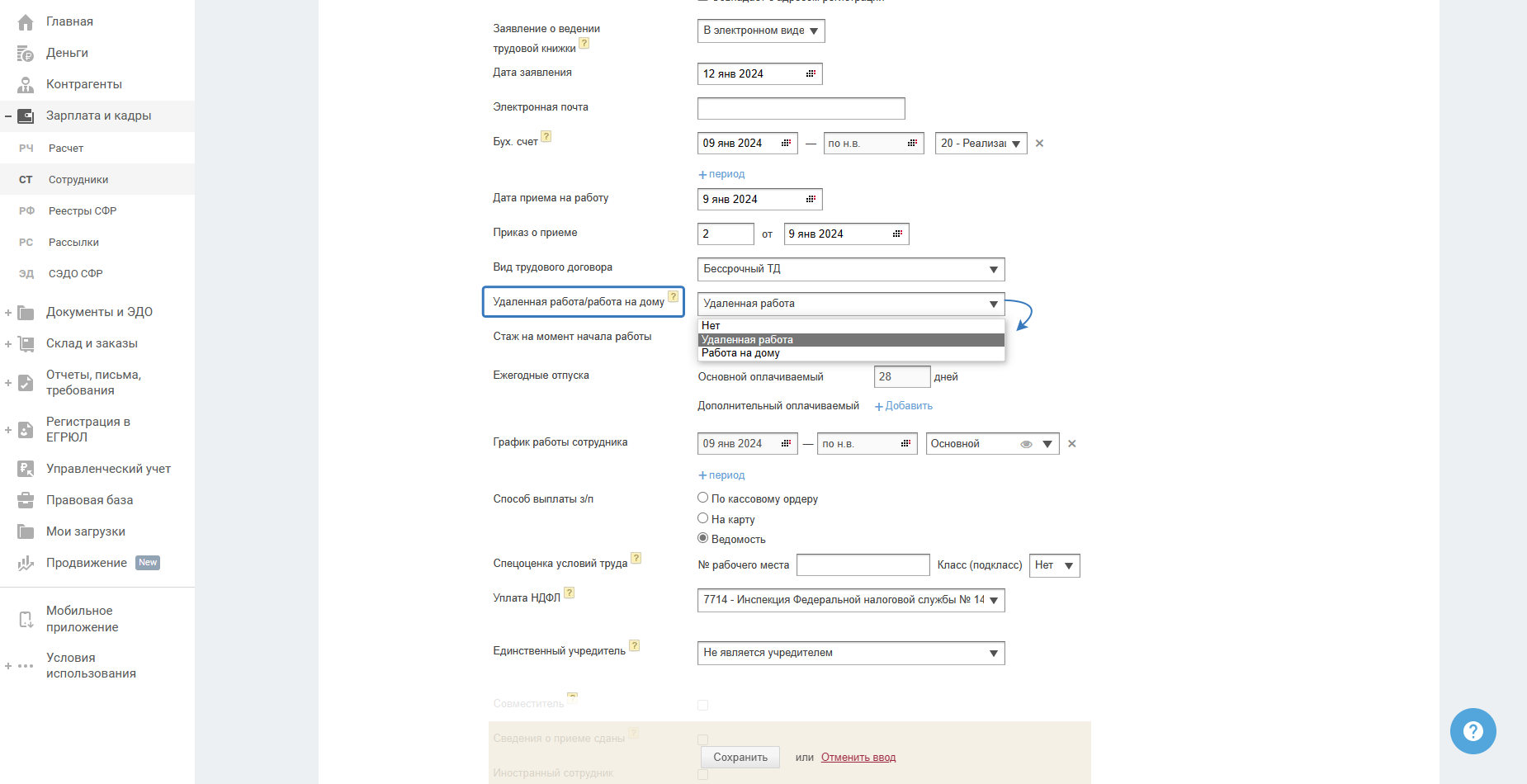 В карточке сотрудника вы можете указать, работает ли сотрудник удалённо или на дому:
