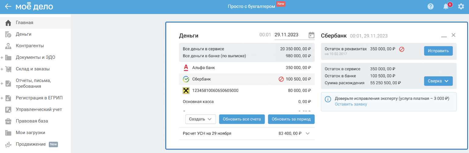 - добавили красный кружок в случае, если остаток не сходится по счёту. При клике на счёт в правой части виджета будут показаны данные по остатку в реквизитах, сравнение остатков в сервисе и банке на сегодня. В зависимости от того, где ошибка, будет показан красный кружок. Так же в правой части виджета можно сразу запросить сверку и посмотреть её результат.