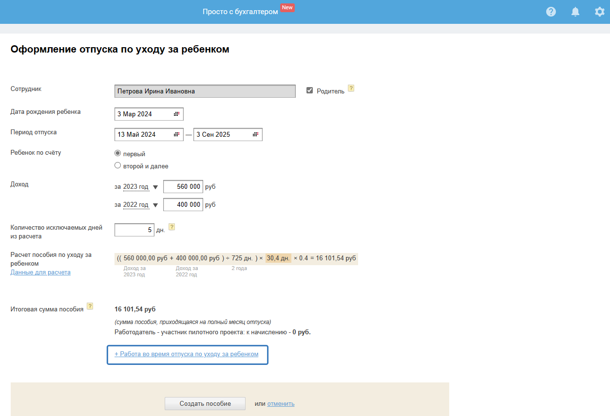 При оформлении отпуска по уходу за ребёнком можно указать дату досрочного выхода на работу. Для этого нажмите «+ Работа во время отпуска по уходу за ребёнком» и укажите дату, с которой сотрудник выходит на работу.