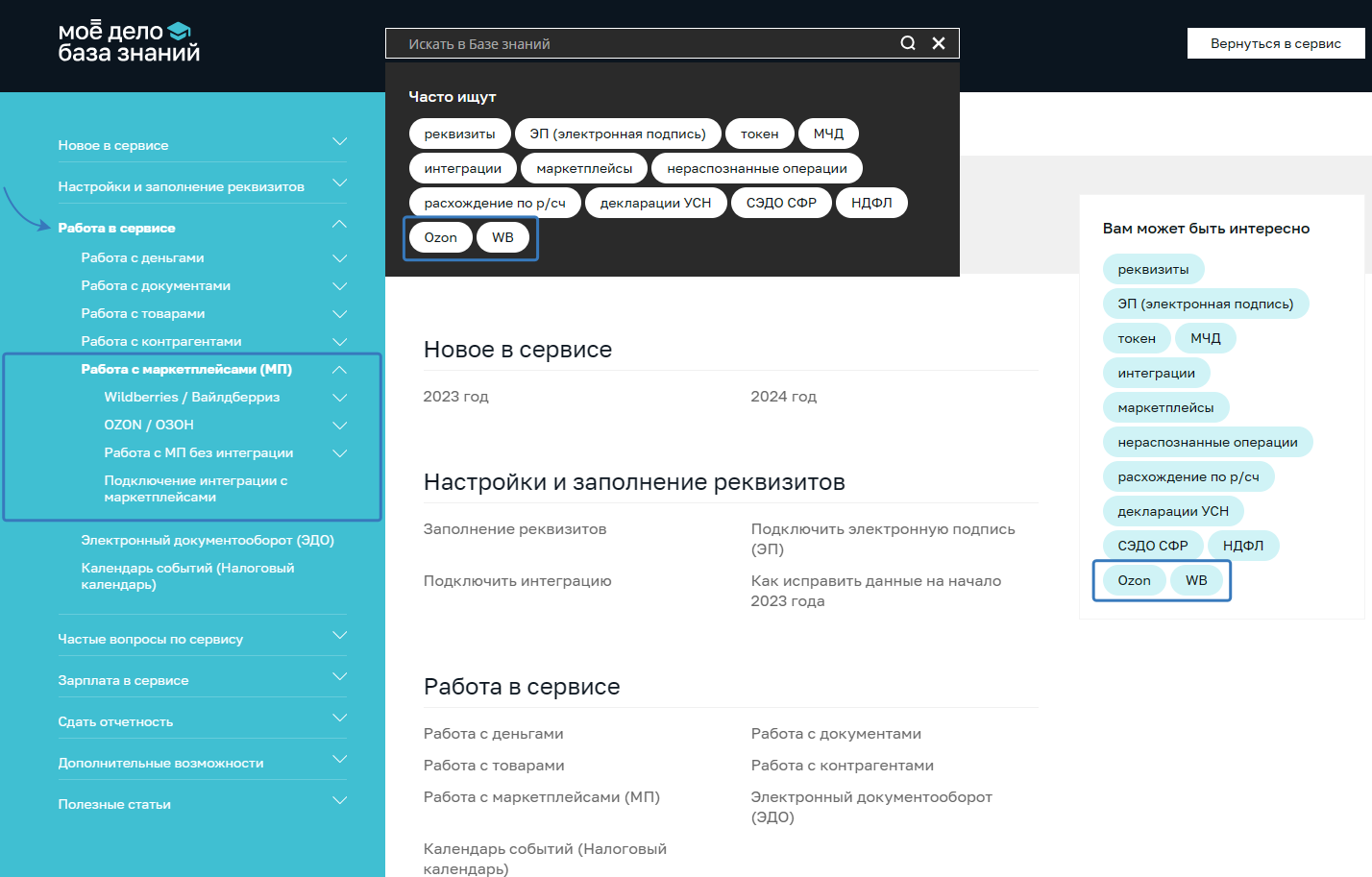 Инструкции по работе с маркеплейсами (МП) выделены в раздел «Работа в сервисе» — «Работа с маркетплейсами (МП)». Также для удобства поиска добавлены теги:
