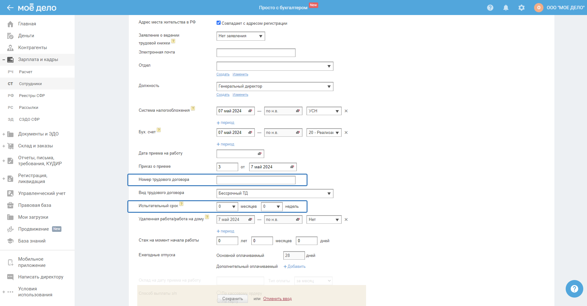 Номер трудового договора и испытательный срок