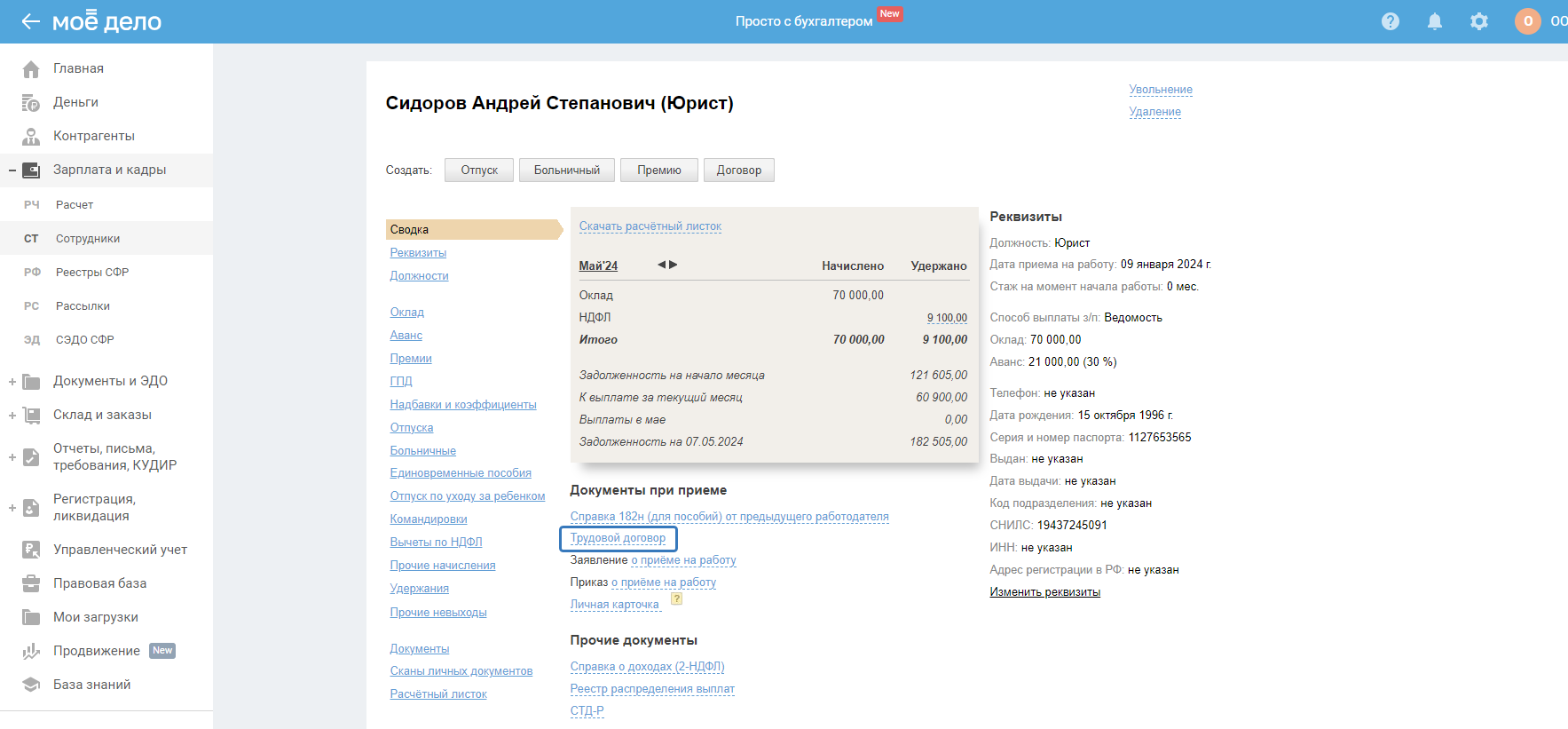Трудовой договор скачивается в реквизитах штатного сотрудника: