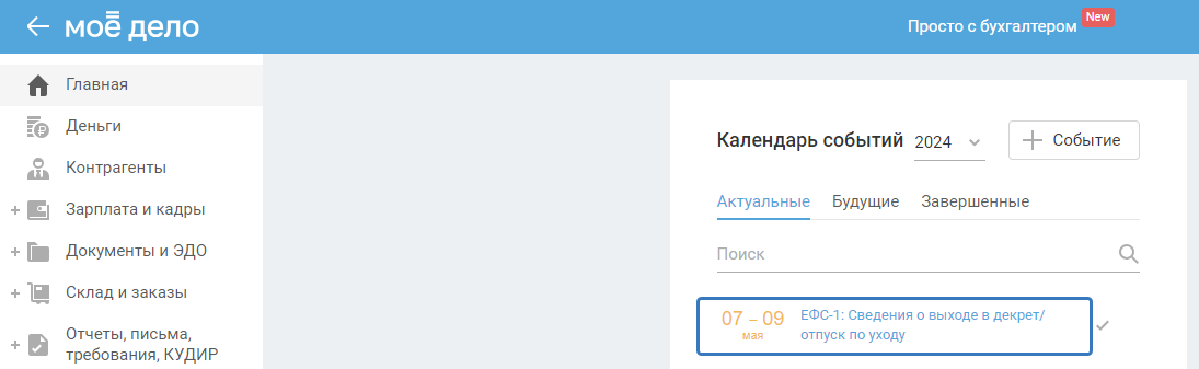 Если вы создали сотруднику декретный отпуск или отпуск по уходу за ребёнком, то в Календаре событий на главной странице появится событие «ЕФС-1: Сведения о выходе в декрет/отпуск по уходу»: