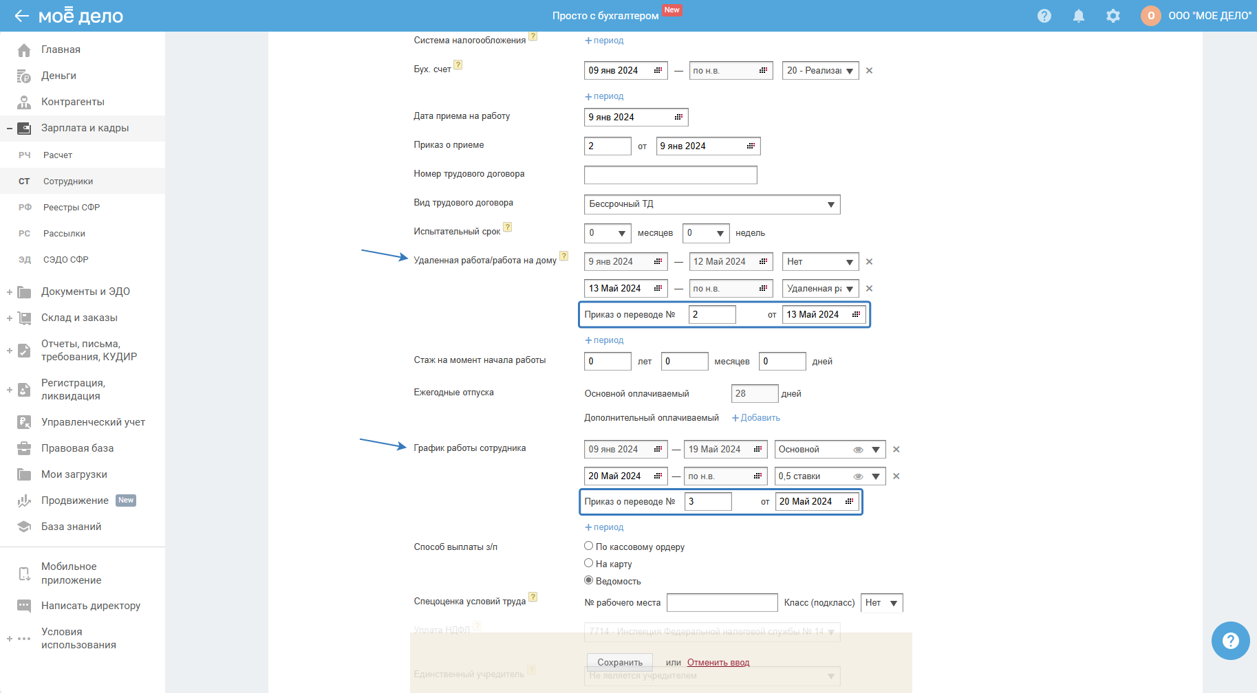 Новые поля в карточке сотрудника Приказ и № приказа об изменении типа работы и графика работы