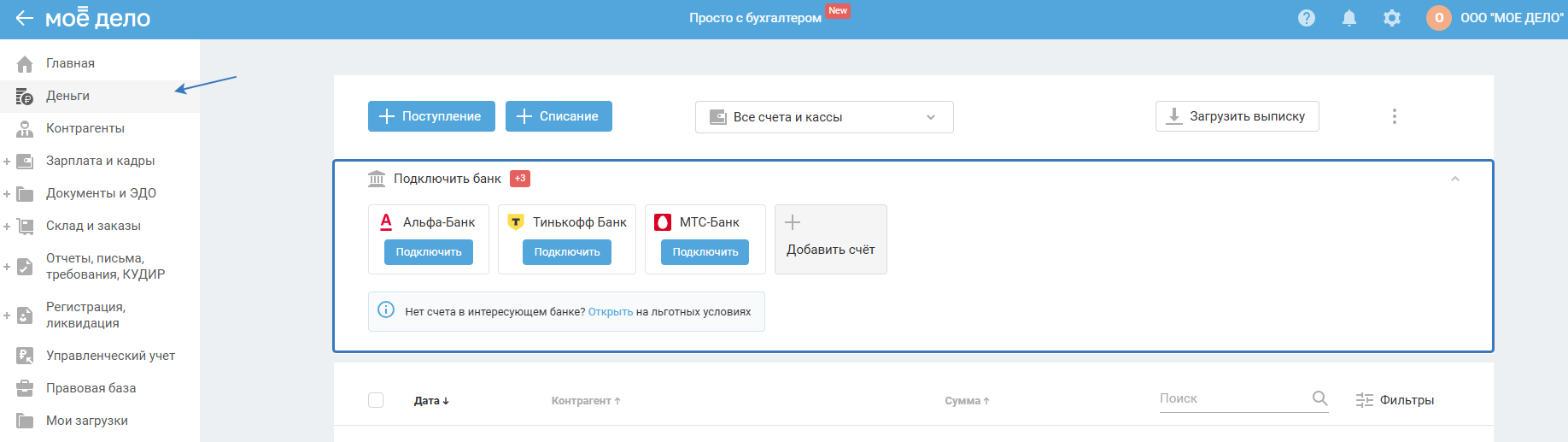 Теперь включать интеграцию с банками, а также добавлять счета можно в разделе «Деньги», т.е. без перехода в раздел «Реквизиты — Настройки денег»: