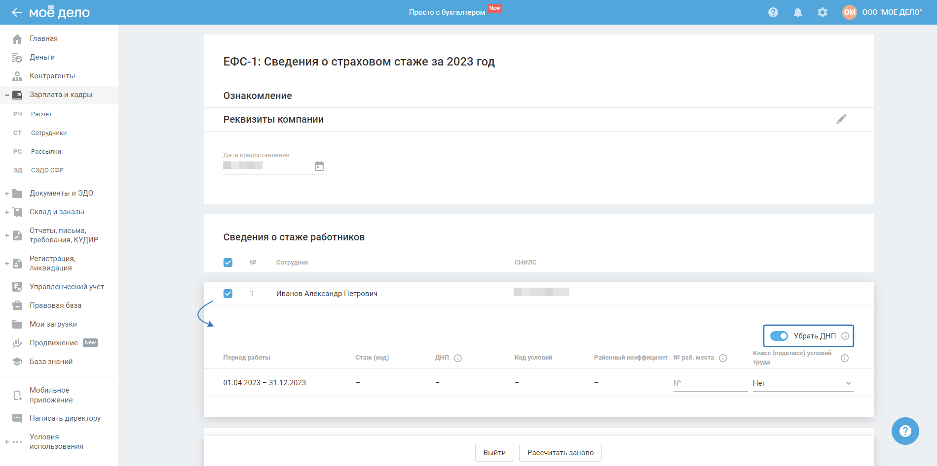 При формировании отчётов появилась возможность включать тумблер «Убрать ДНП». При включении настройки страховой стаж будет отражён без условий досрочного назначения пенсии: