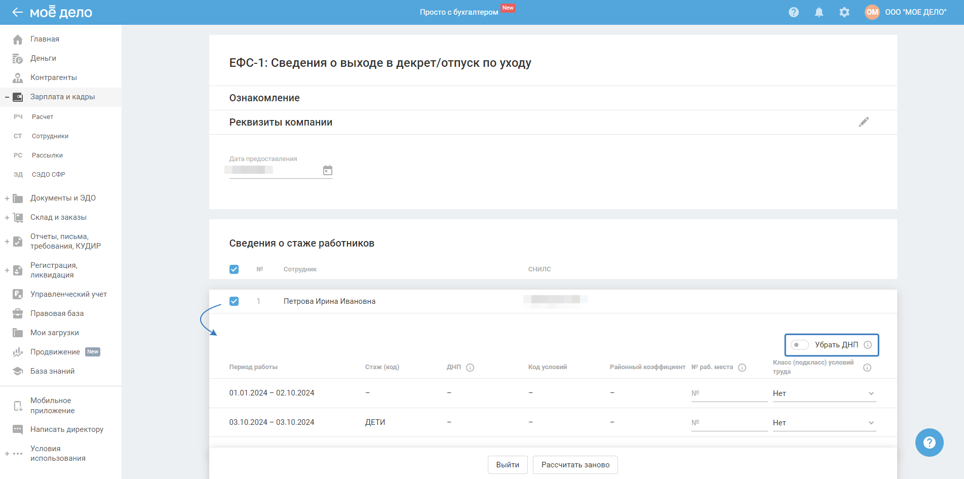 Актуально для отчётов: ЕФС-1: Сведения о страховом стаже (аналог СЗВ-СТАЖ) и ЕФС-1: Сведения о выходе в декрет/отпуск по уходу.