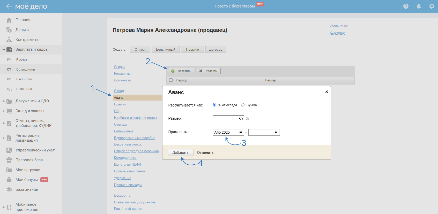 - Перейти в карточку сотрудника, выбрать вкладку «Аванс» и нажать кнопку «Добавить»: