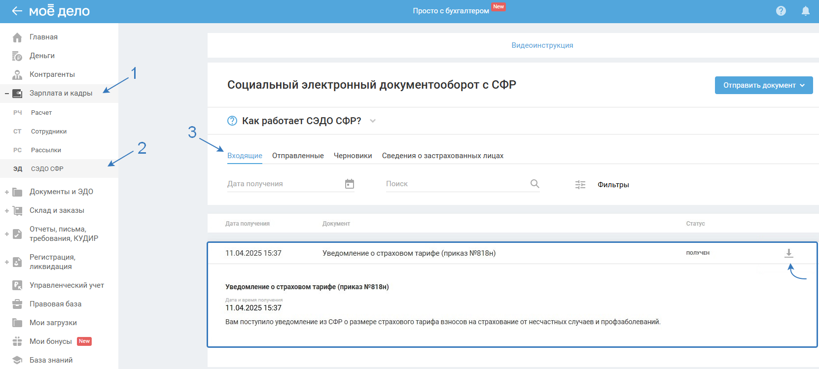 В сервисе добавлен новый тип входящих сообщений от Социального фонда «Уведомление о страховом тарифе (31 тип сообщения)» в разделе «Зарплата и кадры — СЭДО СФР — Входящие».