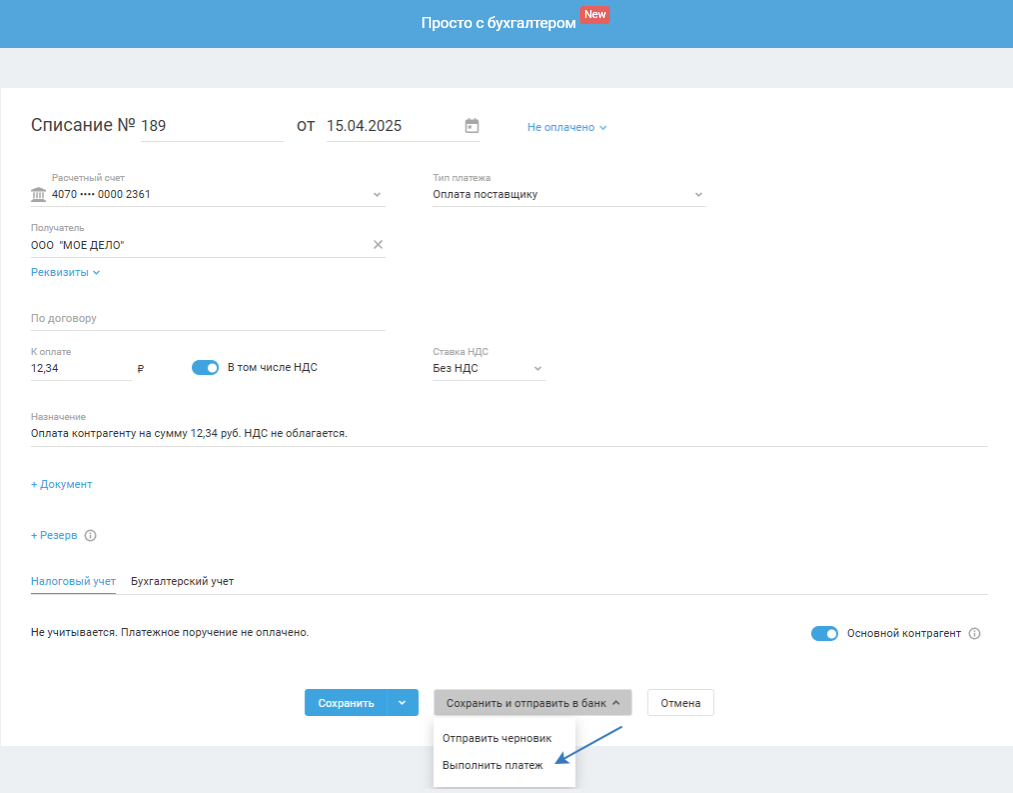 Сквозные (прямые) платежи для прочих контрагентов в разделе «Деньги»
