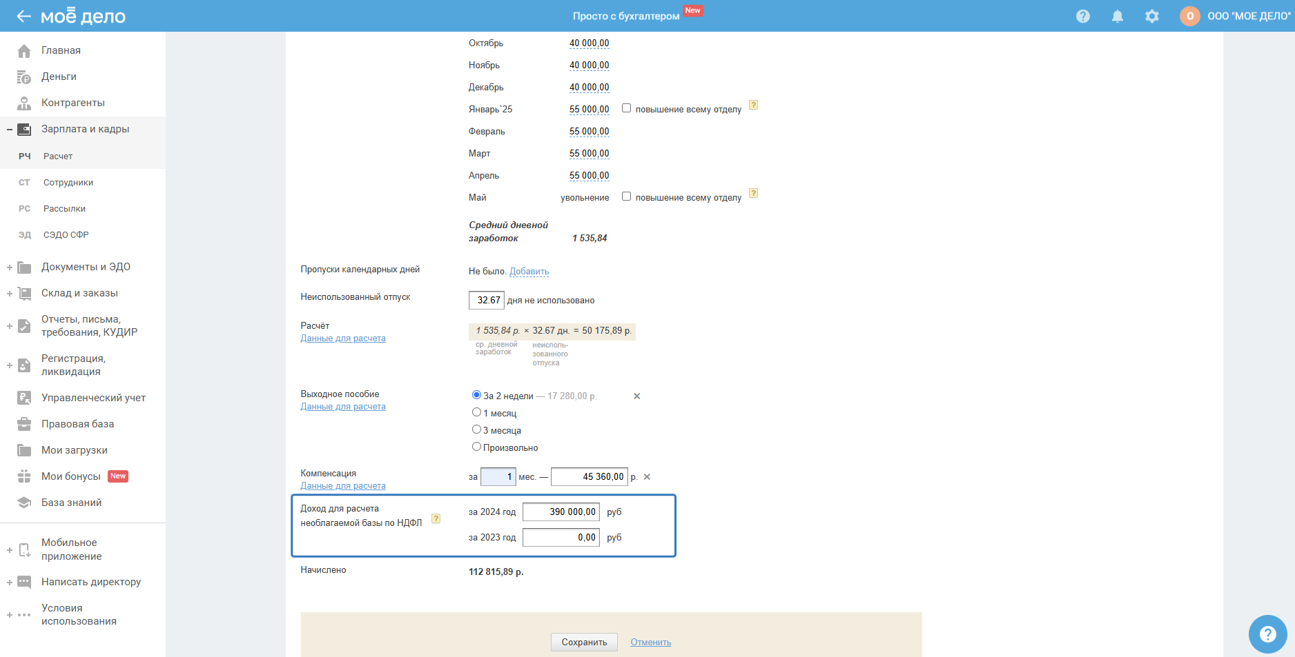 2. В карточке увольнения при добавлении выплат при увольнении теперь появился новый блок «Доход для расчёта необлагаемой базы по НДФЛ»: