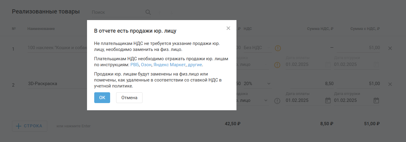 Если в отчёте (в реализации или возвратах) есть продажи юр. лицу:
