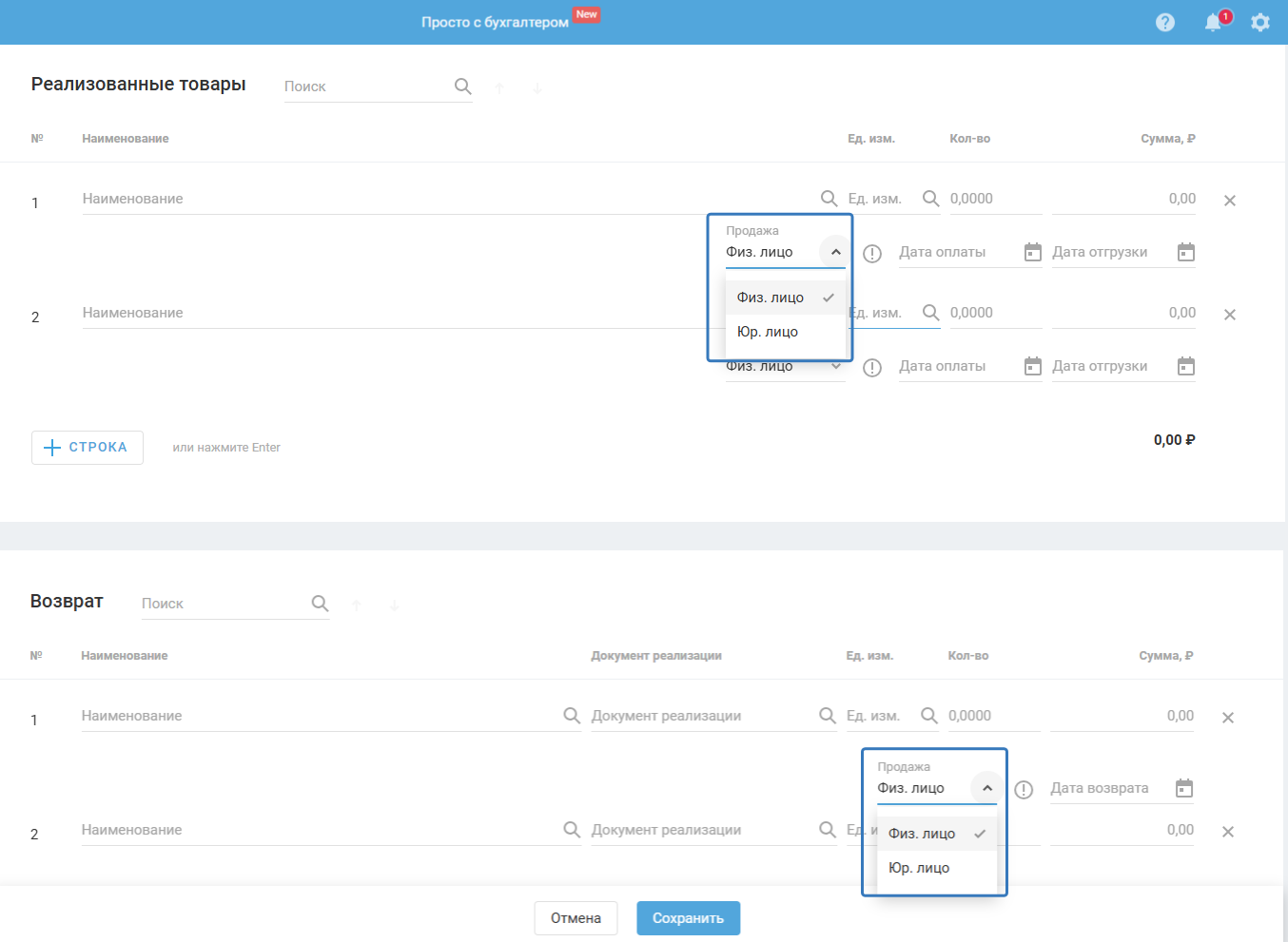 Для каждой позиции в реализованных товарах и в возвратах добавлено поле «Продажа» — выбор между физ. лицом и юр. лицом: