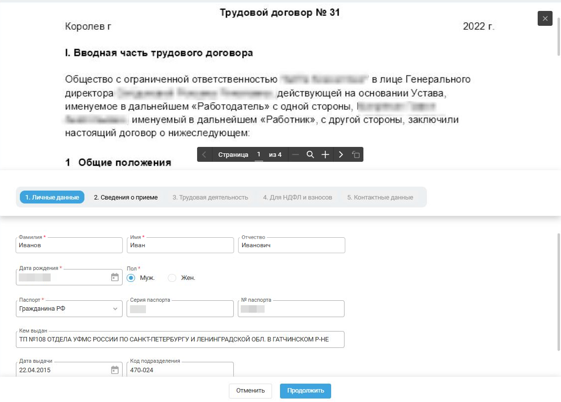 Вы можете быстро просматривать загруженные документы и сразу вводить нужные данные при приёме в карточку сотрудника.