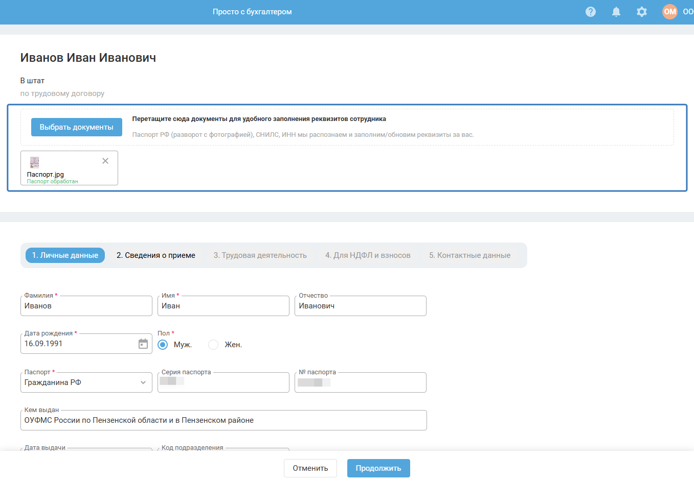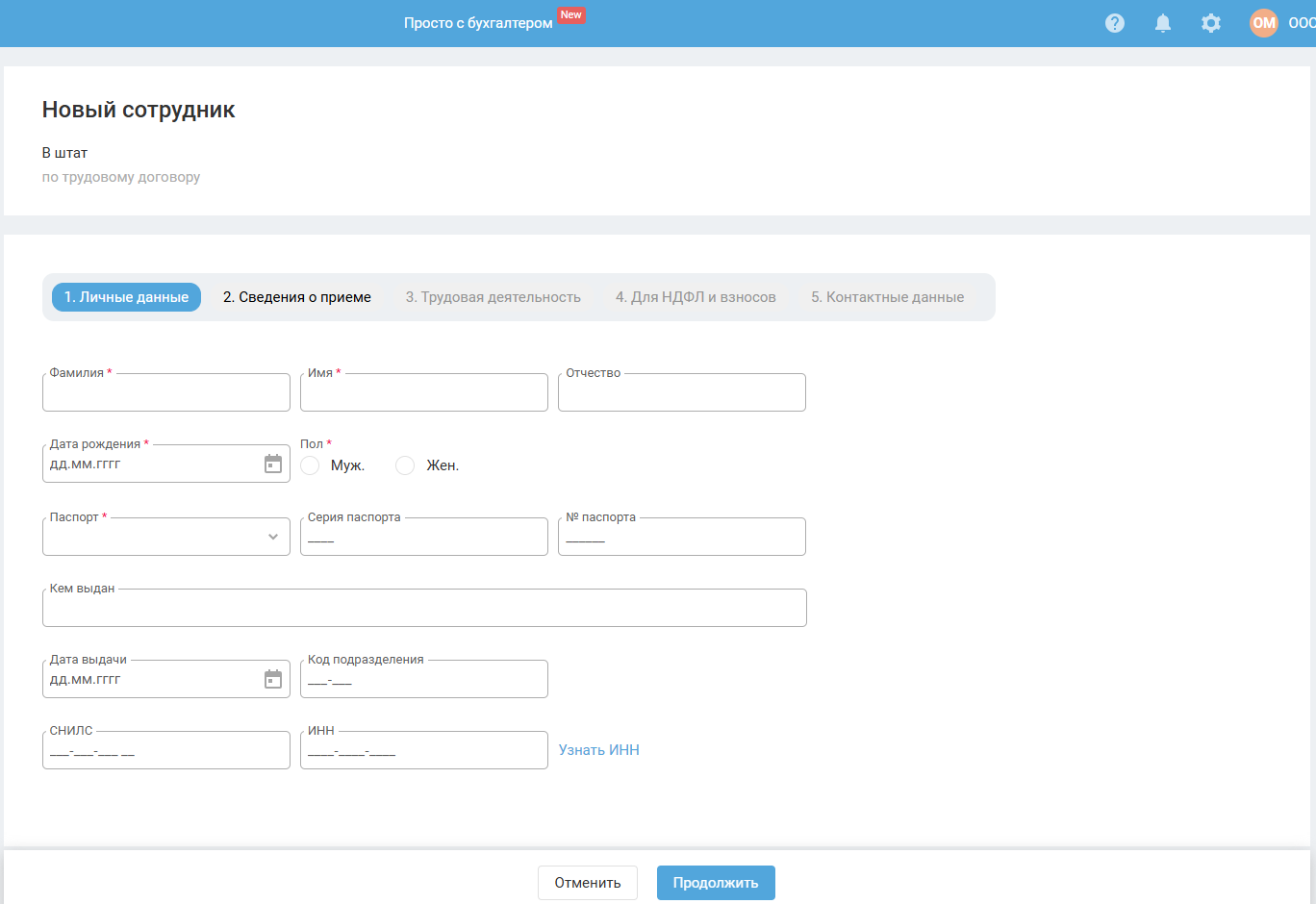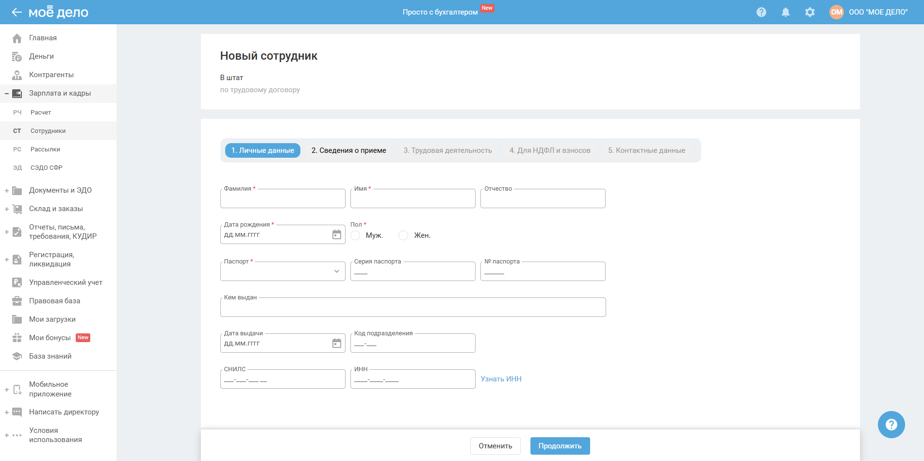 Введите основную информацию о сотруднике: фамилия, имя, отчество, дата рождения, паспортные данные, СНИЛС и ИНН.