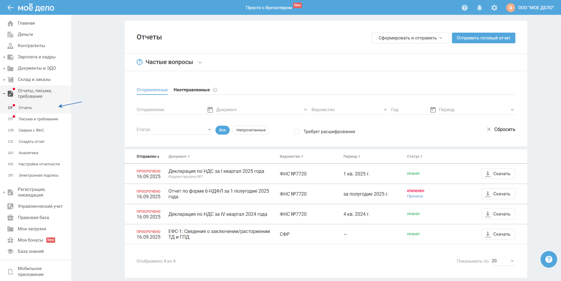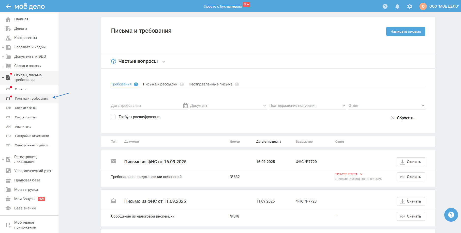 Обновлённые разделы «Отчёты» и «Письма и требования»