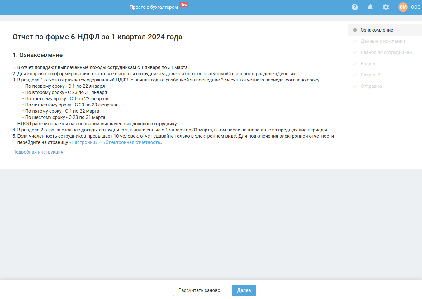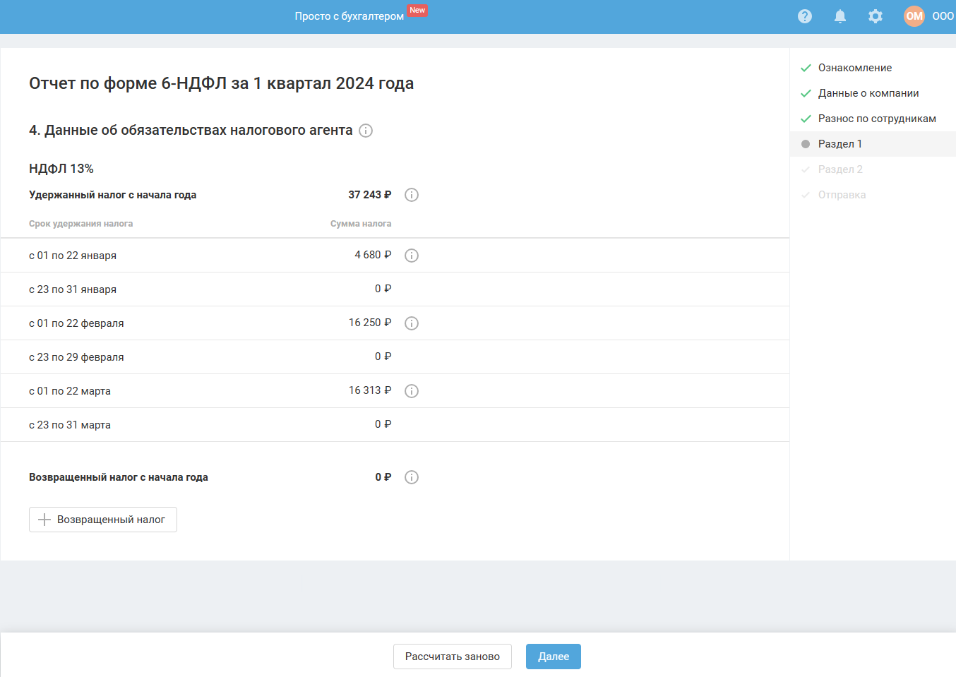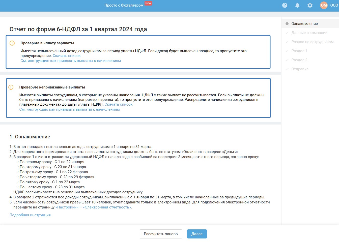 Если в момент прохождения мастера (до его завершения) вы вносили изменения в сервис, связанные с начислением и выплатой зарплаты, тогда для продолжения работы в мастере воспользуйтесь кнопкой «Рассчитать заново».