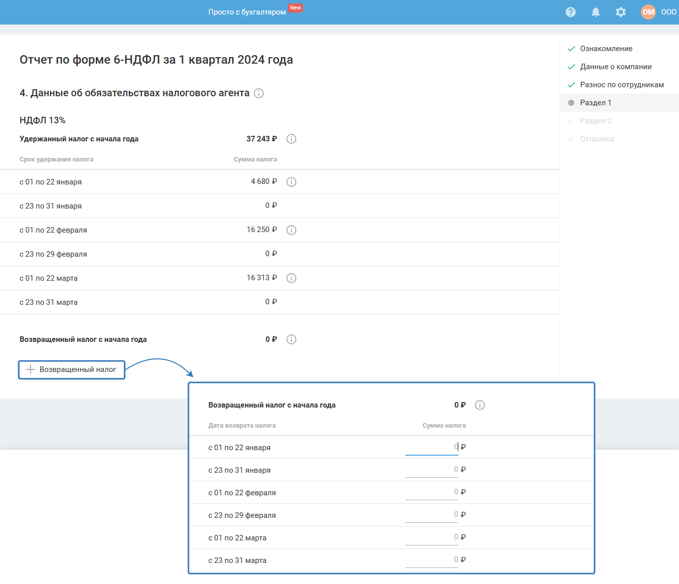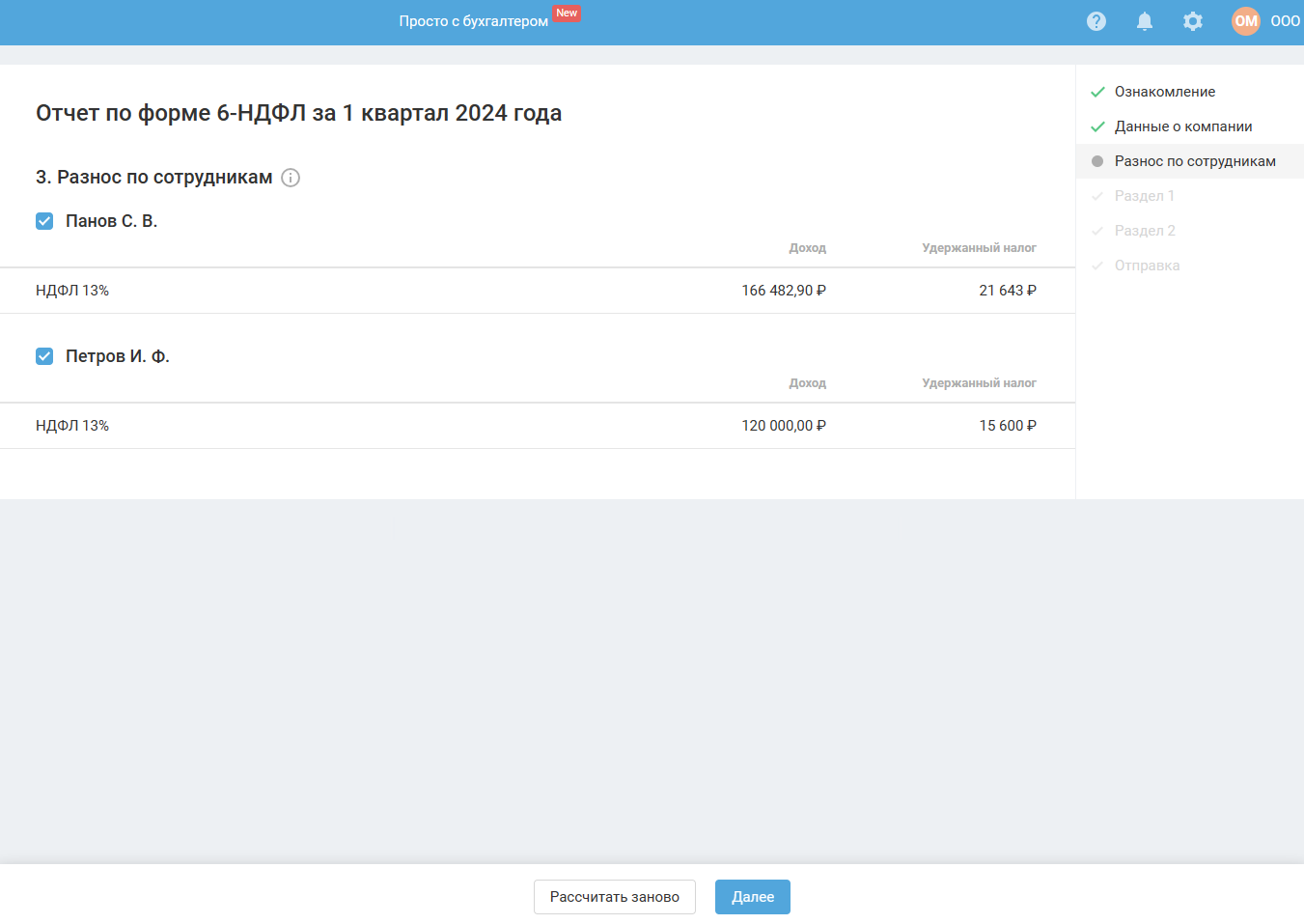 Для ООО: на шаге будут учитываться сотрудники, исходя из внесённых остатков — «Остатки» в разделе «Реквизиты» (Кредит 70 счёта — задолженность). Например, если остатки вводятся на 1 января 2024 года, то задолженность/переплата будет по окладу за декабрь 2023 года. Если выплата в 2024 году по остаткам полностью погашает задолженность, то в отчёте данного сотрудника отображаются доходы за декабрь предыдущего года с датой удержания налога текущего года. Срок перечисления — следующий рабочий день с учётом выходных. Дебет 70 счёта (переплата) в отчёте 6-НДФЛ не учитывается.