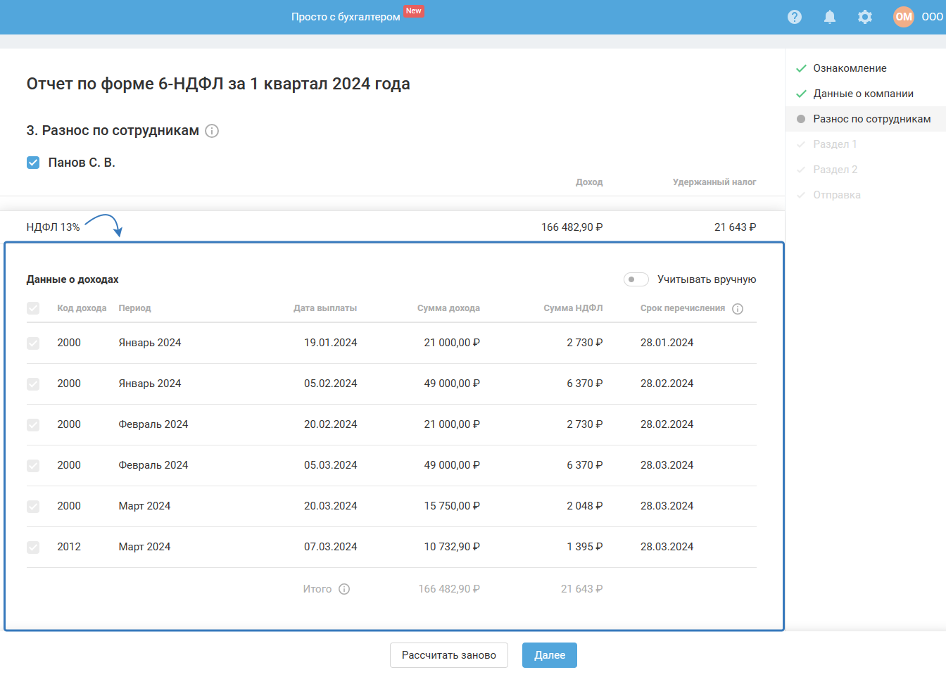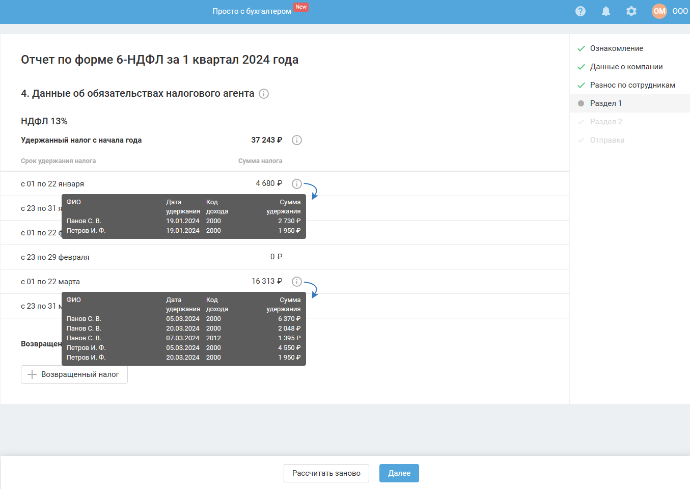 Если в отчёте (за 1 квартал) было указано «нет данных» по сотруднику, а платежи за этот период появились в сервисе, то в следующий отчёт (за полугодие) платежи подтянутся, если их дата входит в отчётный период. Например, Иванову И.И. не выплатили зарплату за март 2024 года. Отчёт за 1 квартал завершён: по зарплате за март «нет данных». Зарплата за март была выплачена 10 апреля. При формировании отчёта за полугодие, включив тумблер, из предыдущего подтянется: зарплата за март с датой удержания 10 апреля, суммой удержанного налога, сроком перечисления 12 апреля.