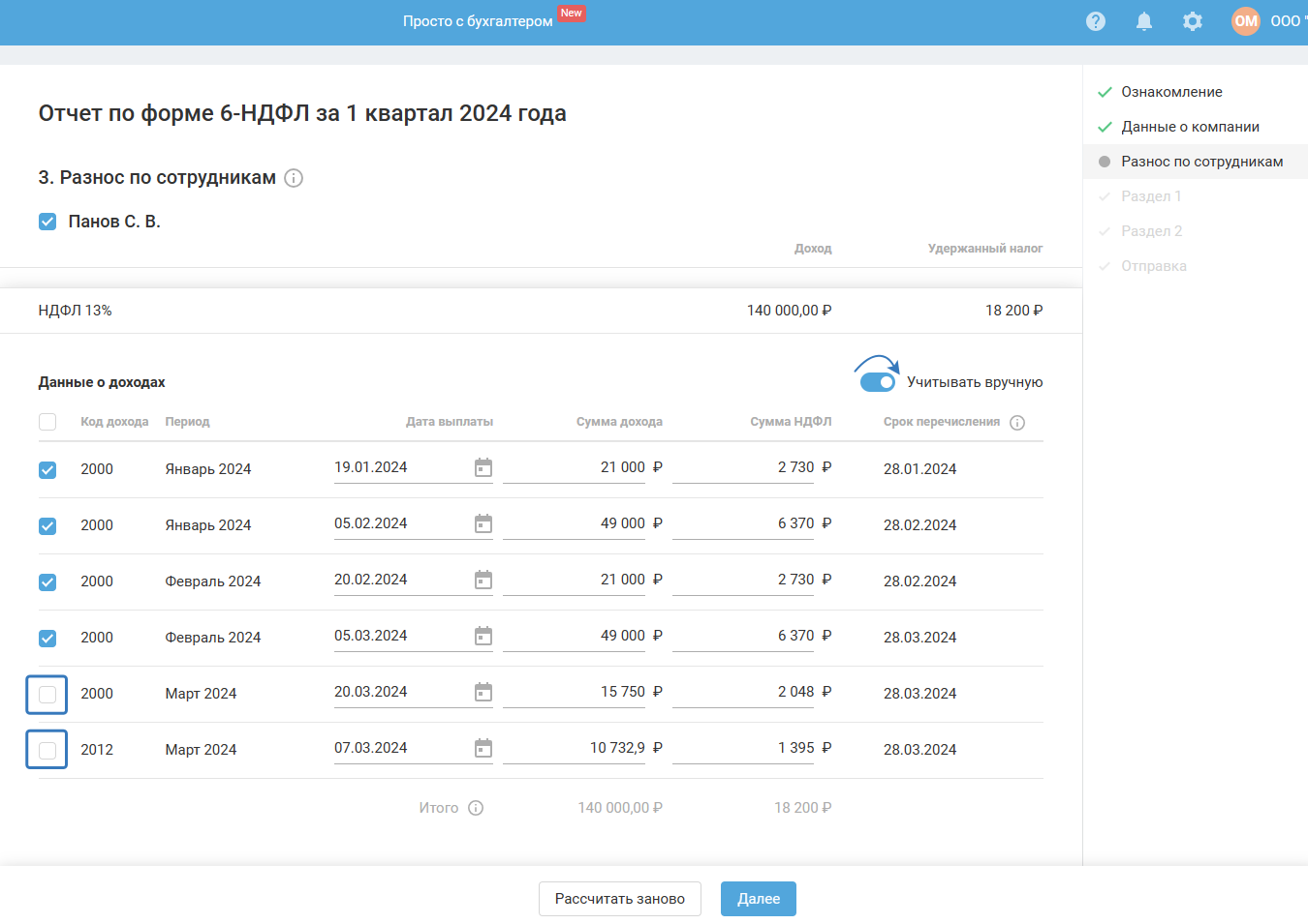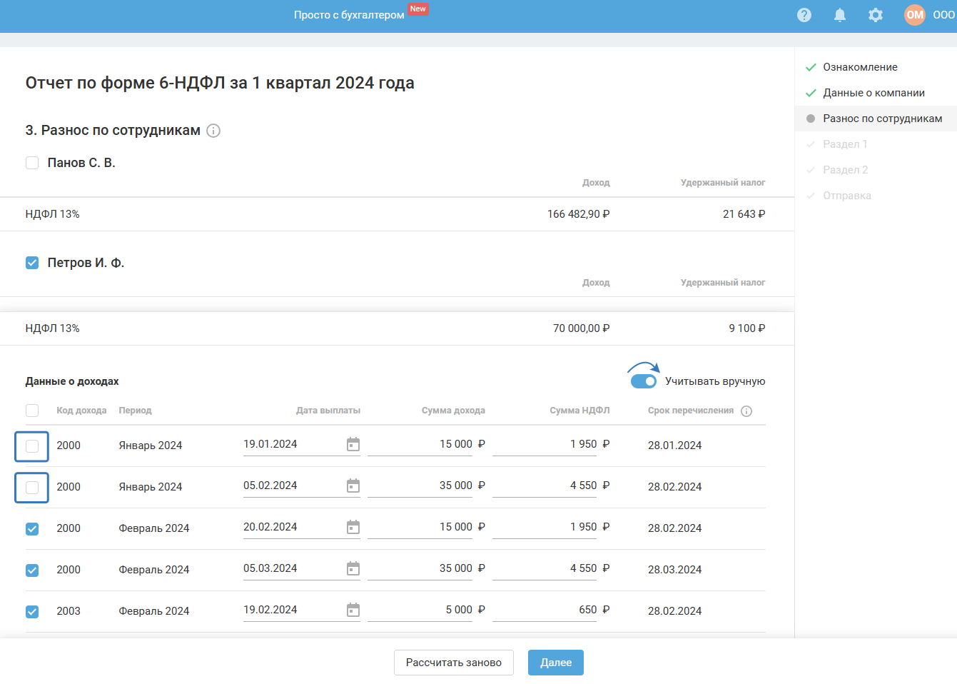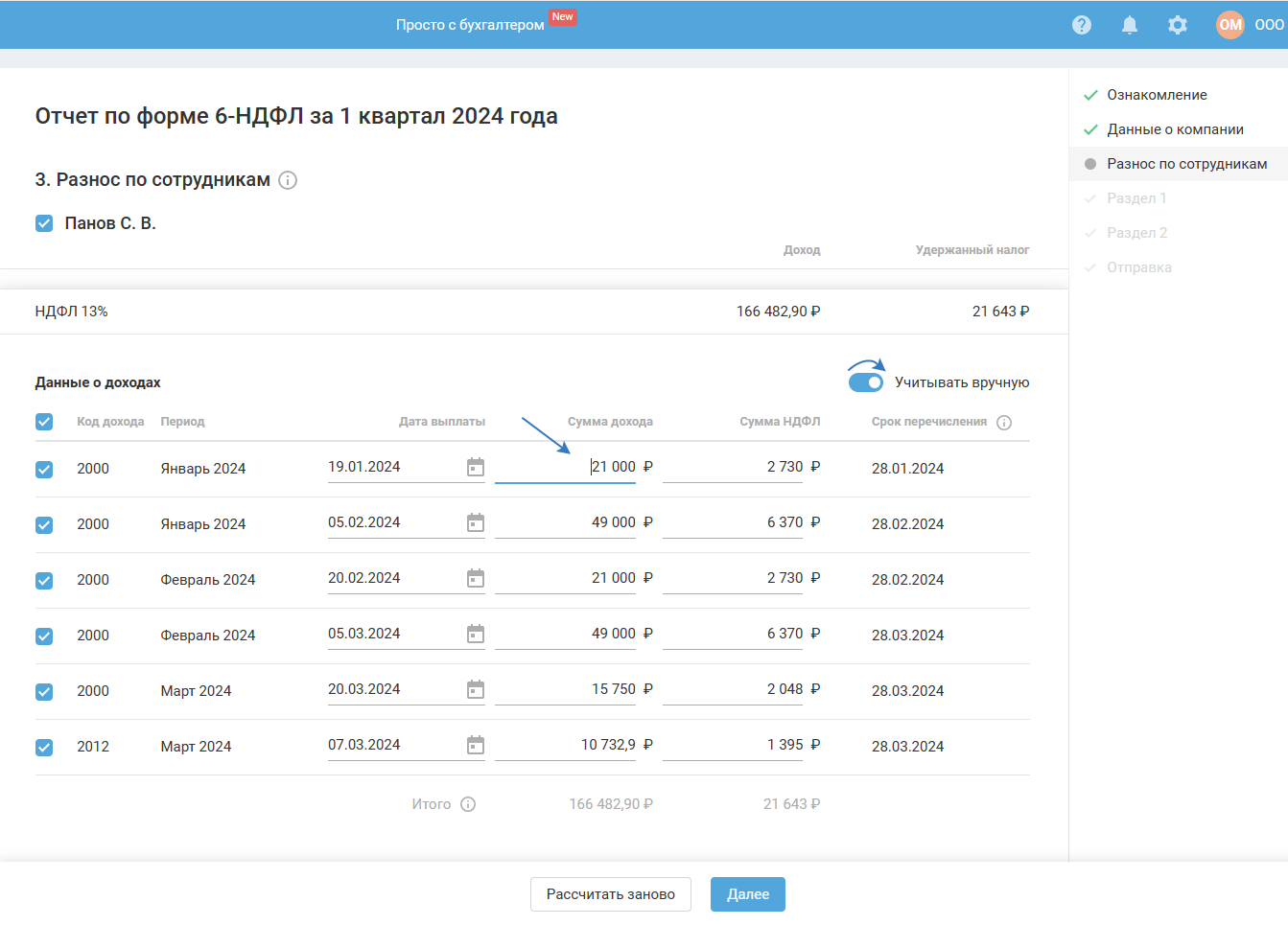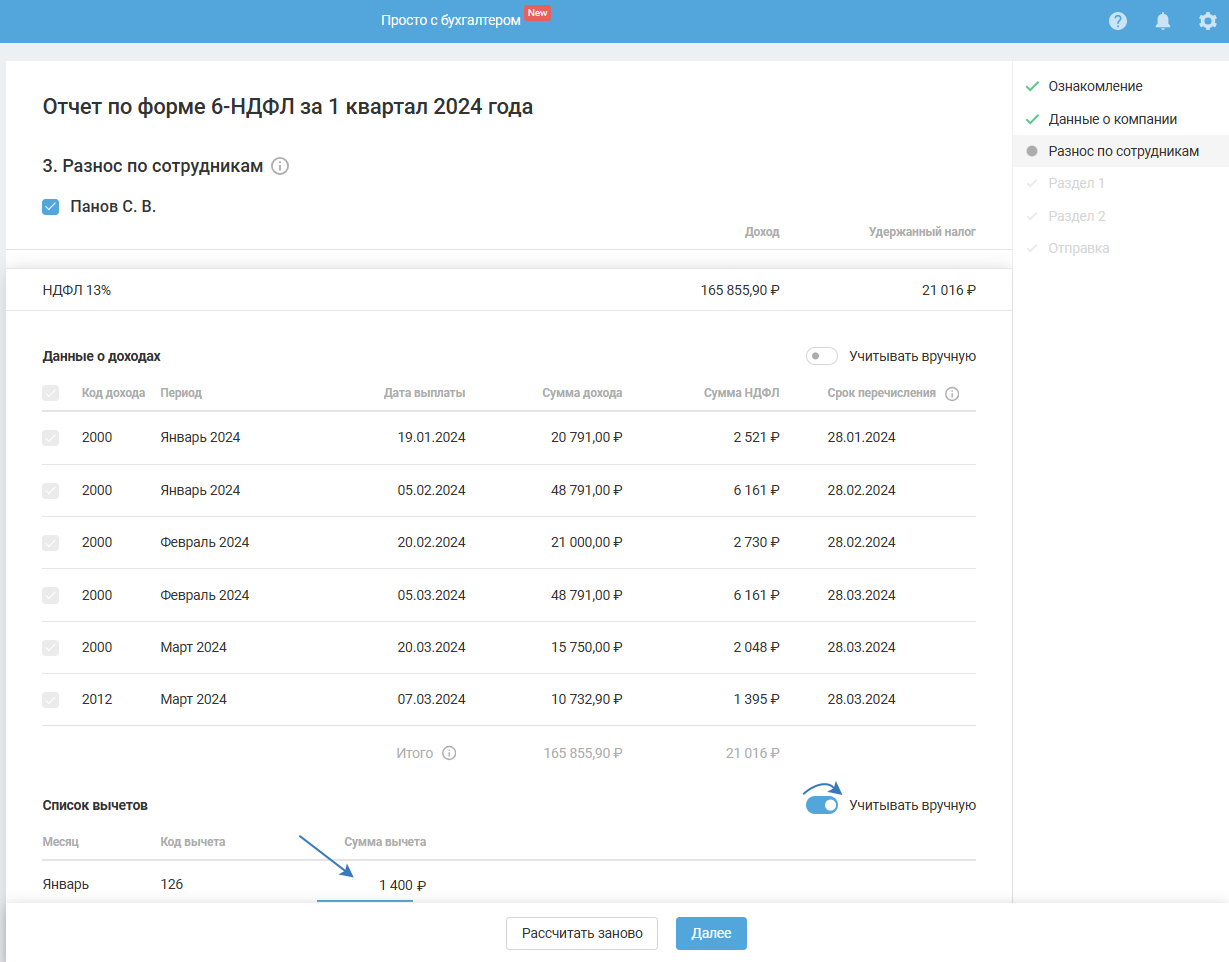 Для редактирования значений в списке доходов и вычетов перейдите на шаг «Разнос по сотрудникам».