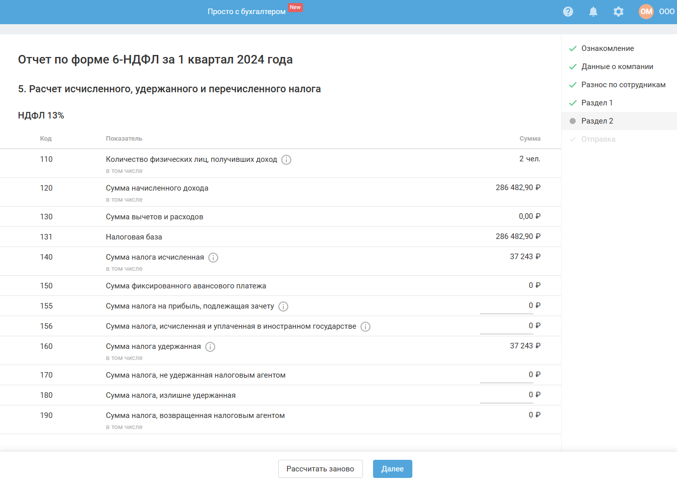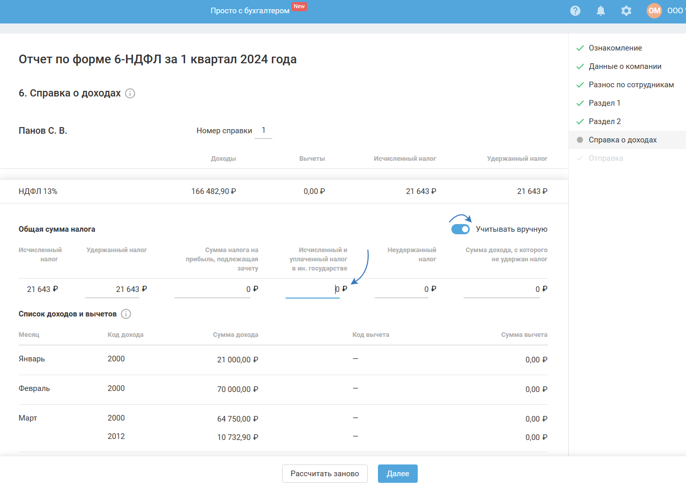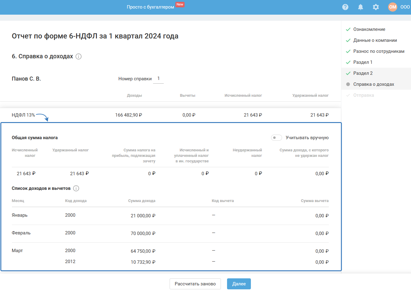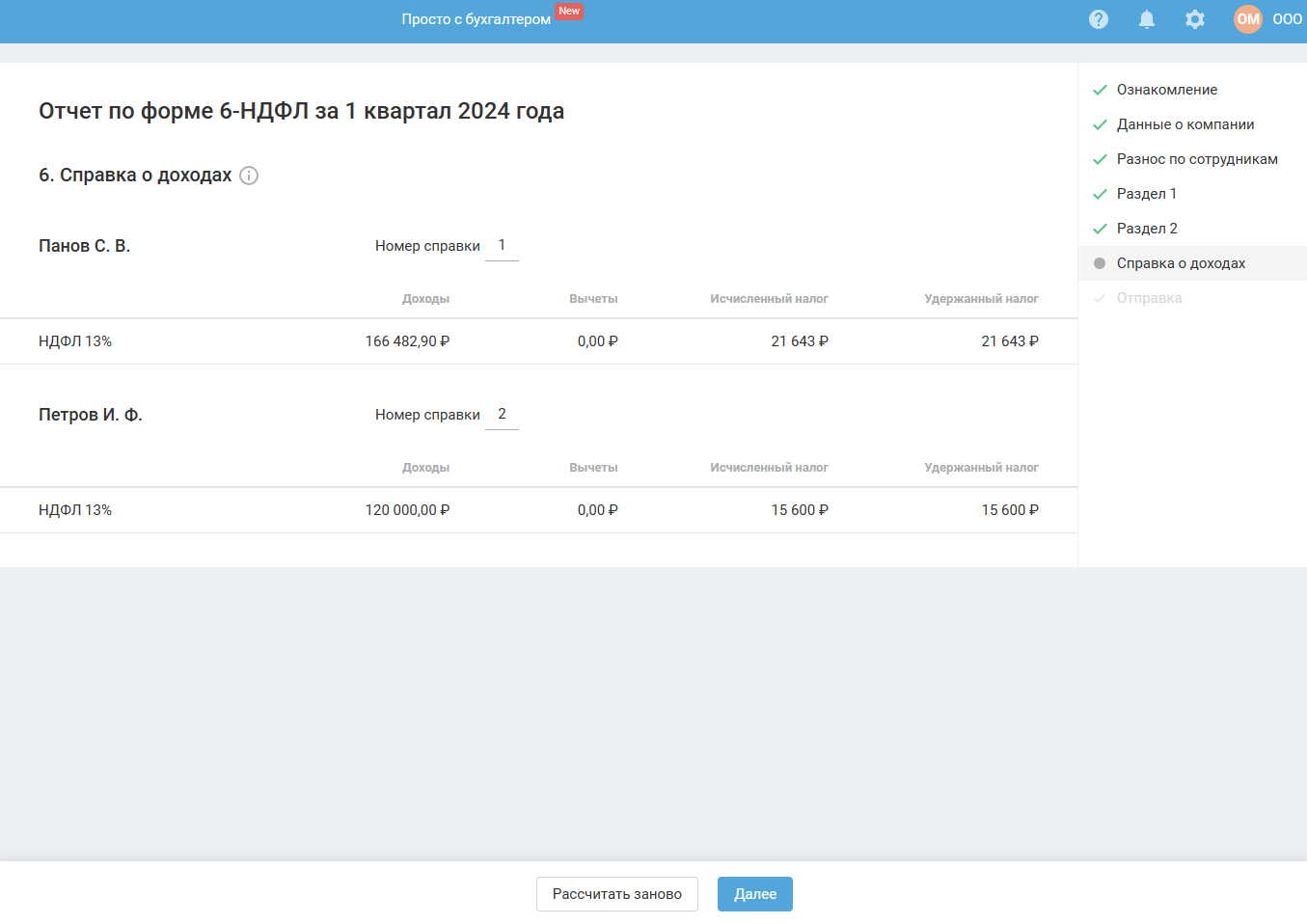 Данные, отображенные на этом шаге, являются вспомогательными для последующего заполнения разделов 1 и 2 расчёта 6-НДФЛ и справки о доходах. Справка о доходах формируется при формировании отчёта за год или в случае прекращения деятельности.