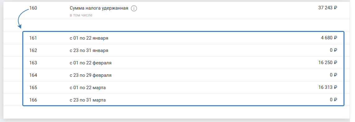 12) в строке 160 «Сумма налога удержанная» отображается сумма налога, если дата выплаты дохода, с которого удерживается НДФЛ, приходится на период с 1 января по последнее число квартала, за который формируется отчёт: