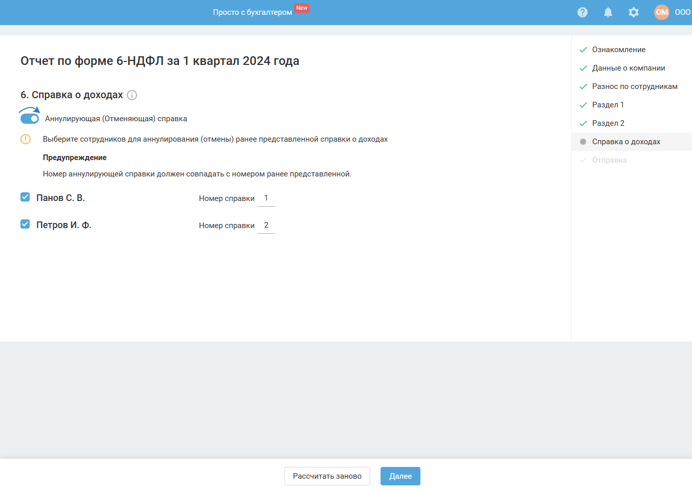 Если вы хотите подать аннулирующую (отменяющую) справку, то включите тумблер (появится, если на шаге 2 «Данные о компании» включена настройка «Ликвидация/Реорганизация» и «Корректировочный отчёт» с номером корректировки 1 и более):