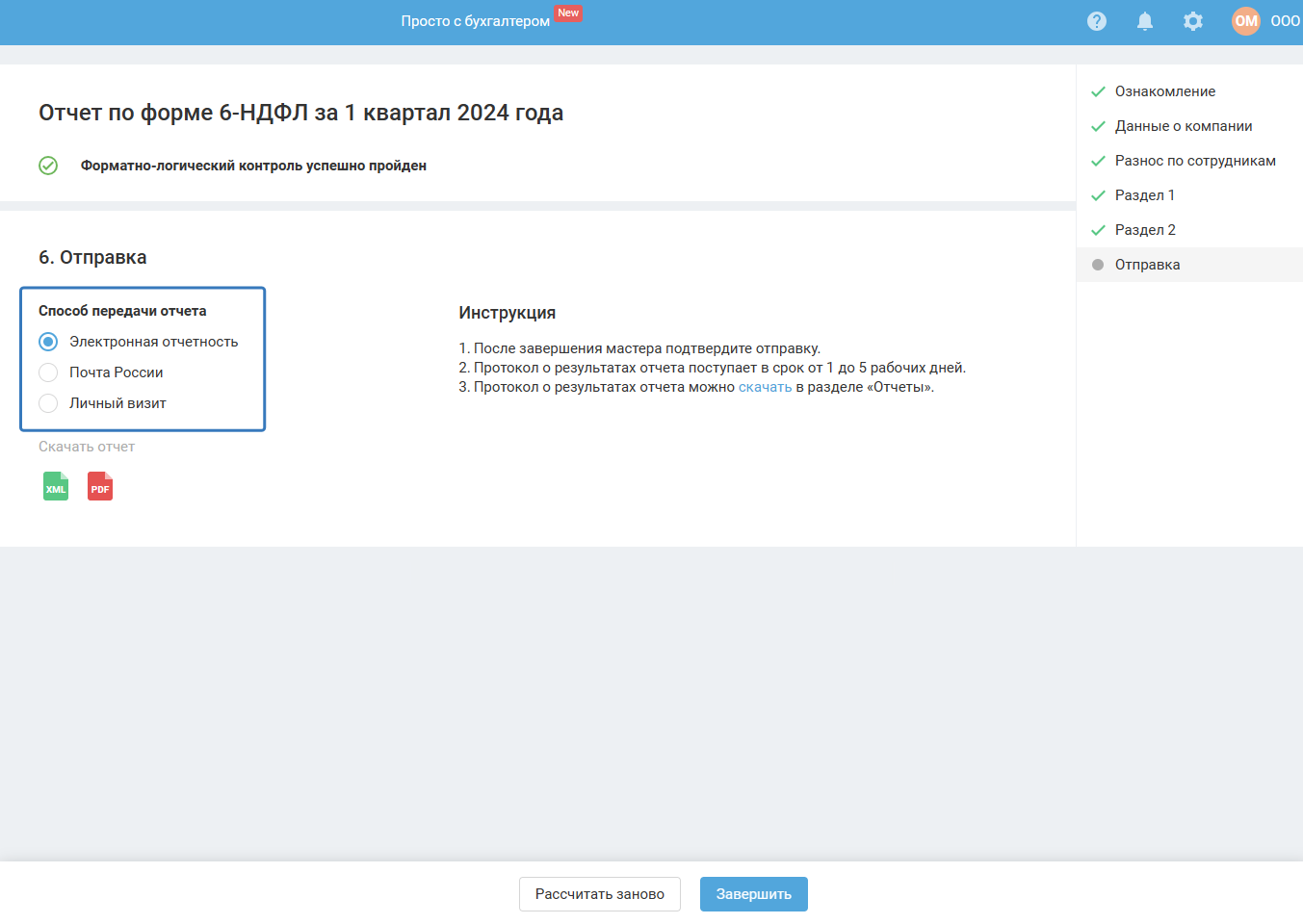 Пройдите отчёт до конца, нажимая кнопку «Далее» на каждом этапе. На шаге «Отправка» нажмите «Завершить» и подтвердите отправку отчёта.