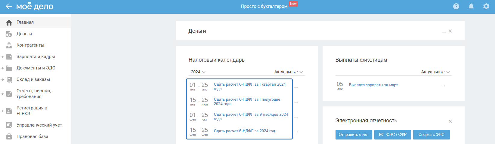В «Налоговом календаре» нажмите на действие «Сдать расчёт 6-НДФЛ за ___»: