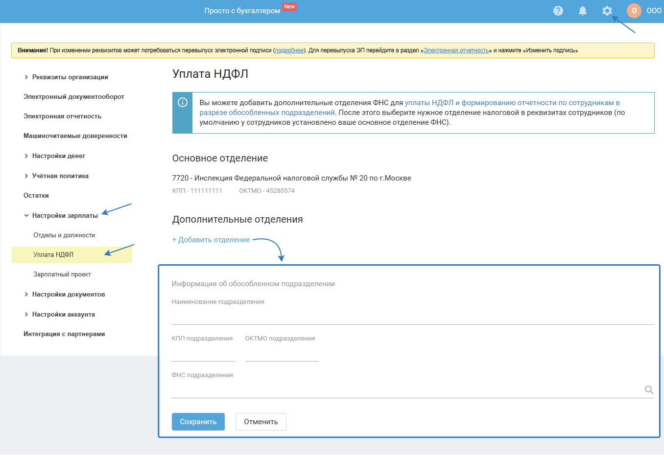 1. Нажмите на значок шестерёнки, перейдите в раздел «Настройки зарплаты», выберите подраздел «Уплата НДФЛ» и нажмите «+ Добавить отделение».