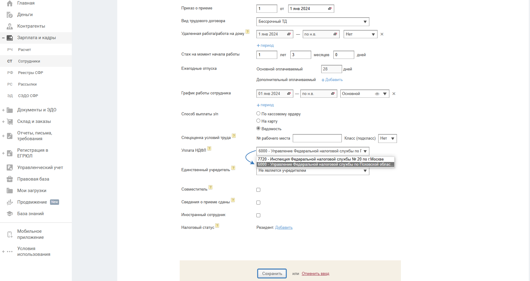 2. В реквизитах сотрудника в поле «Уплата НДФЛ» выберите из выпадающего списка налоговую, в которую вы будете платить НДФЛ с доходов сотрудника и сдавать отчёт 6-НДФЛ: