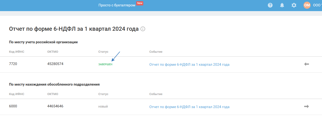 На странице списка отчётов 6-НДФЛ статус отчёта будет изменён на «Завершён»: