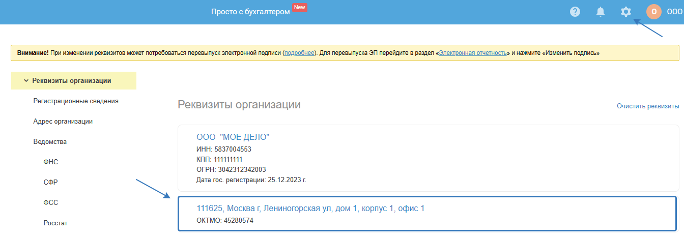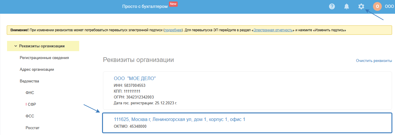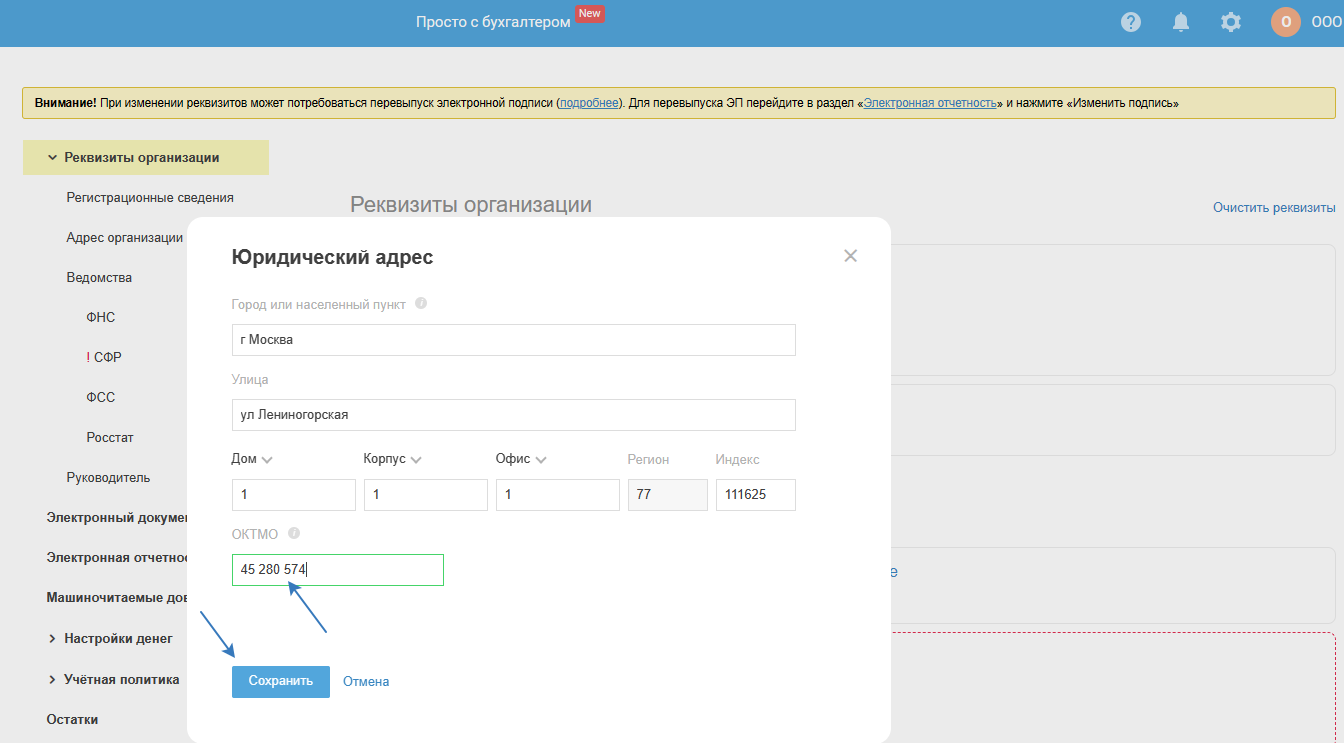 После того как отчёт по старому ОКТМО подготовлен, перейдите в раздел «Реквизиты» и нажмите на блок с адресом организации: