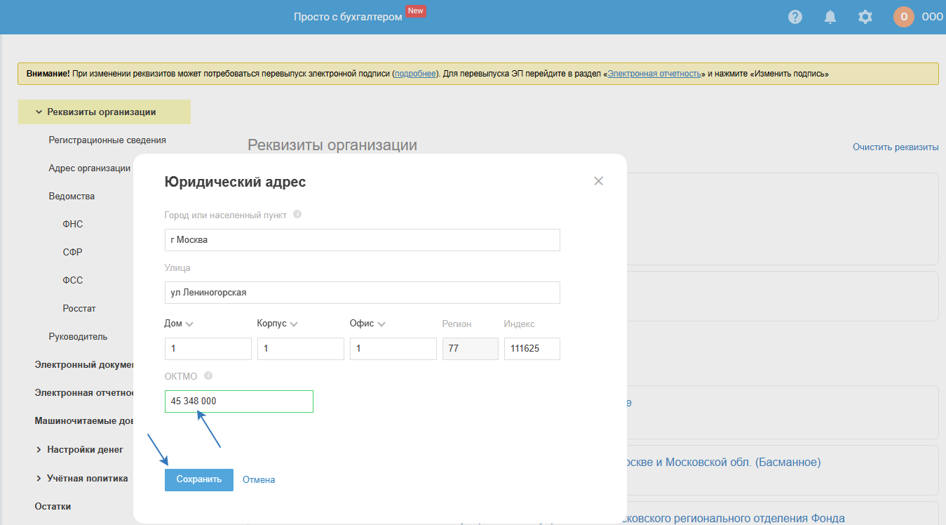 В открывшемся окне в поле ОКТМО укажите новый ОКТМО, нажмите «Сохранить»: