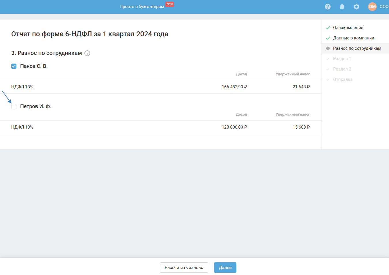 На шаге отображаются все сотрудники (в штате/вне штата) при условии, что хотя бы одна дата выплаты дохода приходится на отчётный период: