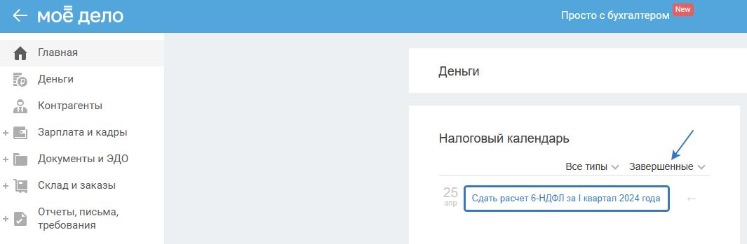 После чего перейдите в мастер формирования отчёта 6-НДФЛ во вкладке «Завершённые» в «Налоговом календаре»: