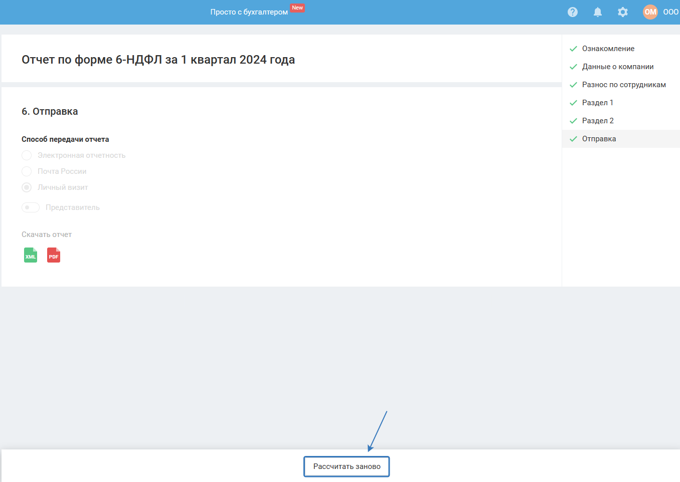Если в момент прохождения мастера (до его завершения) вы вносили изменения в сервис, то для продолжения работы в мастере воспользуйтесь кнопкой «Рассчитать заново». Если всё верно, выберите способ отправки и нажмите «Завершить».