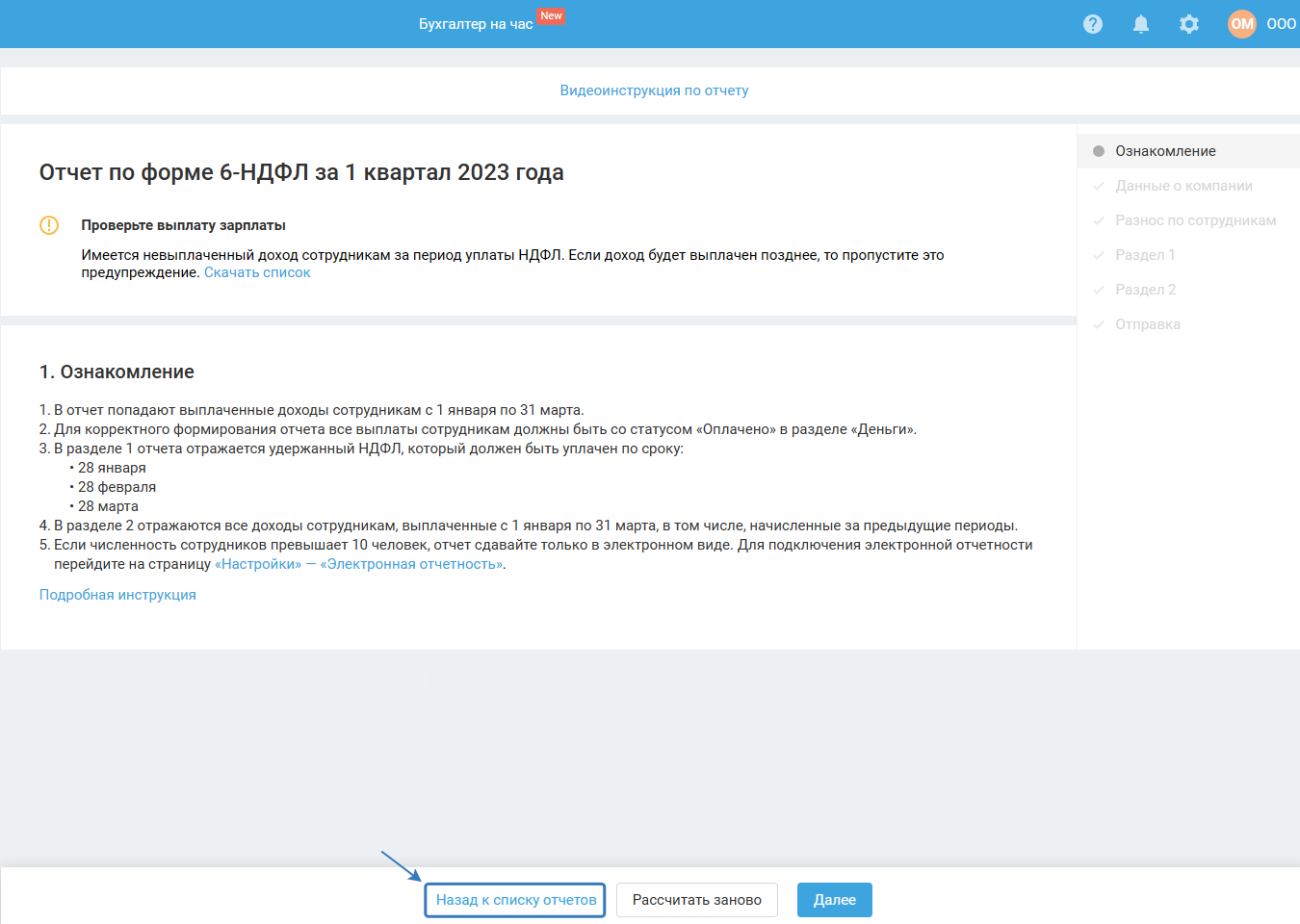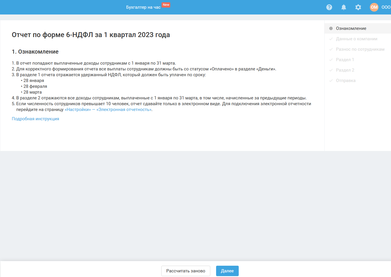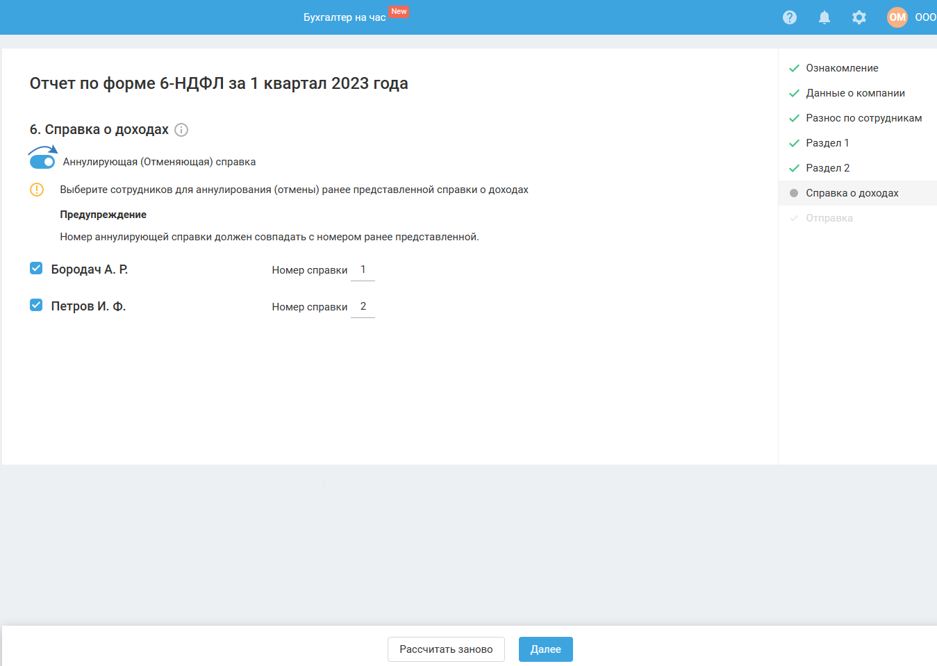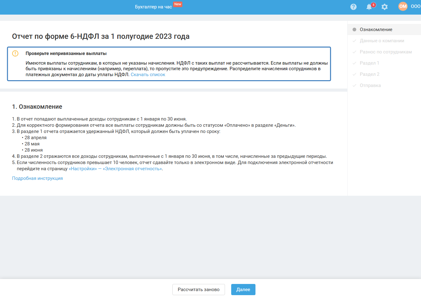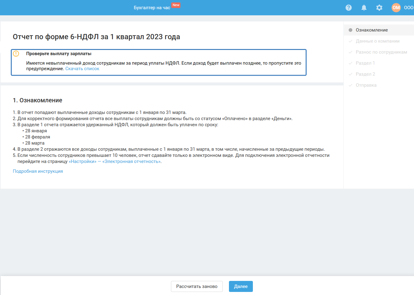 Если в момент прохождения мастера (до его завершения) вы вносили изменения в сервис, связанные с начислением и выплатой зарплаты, тогда для продолжения работы в мастере воспользуйтесь кнопкой «Рассчитать заново».