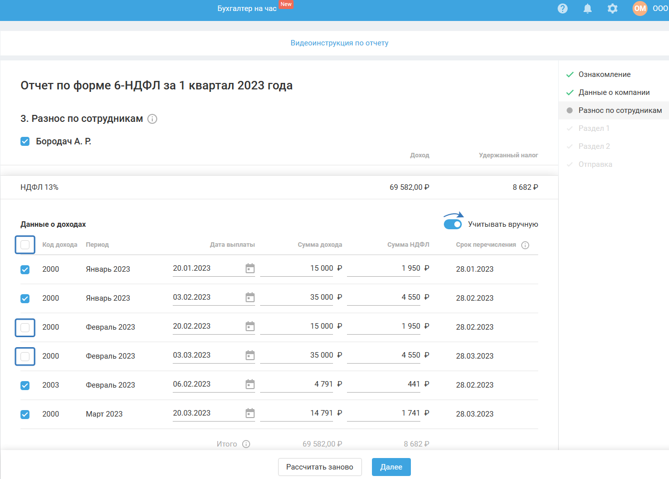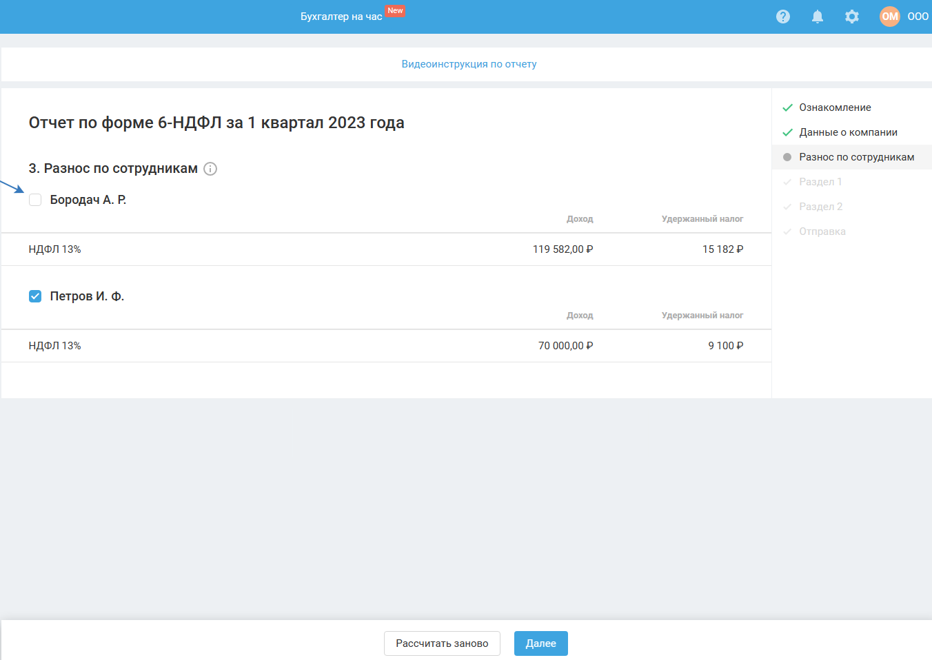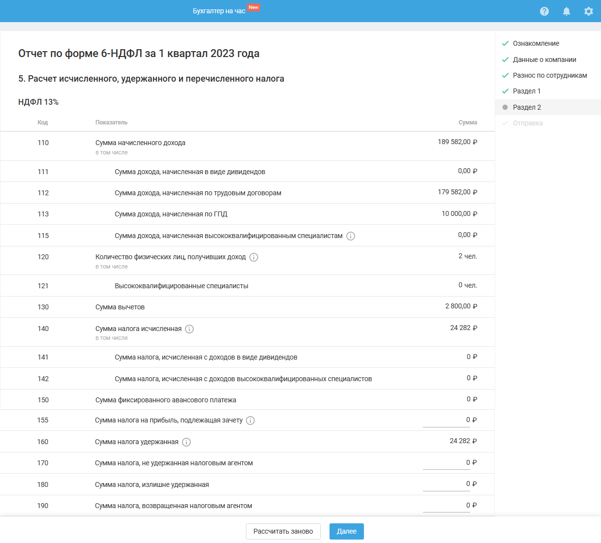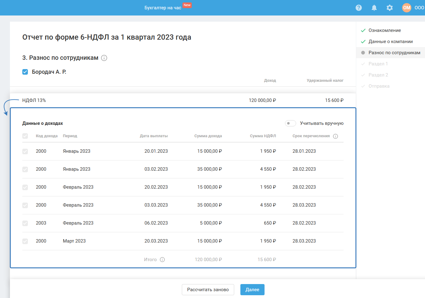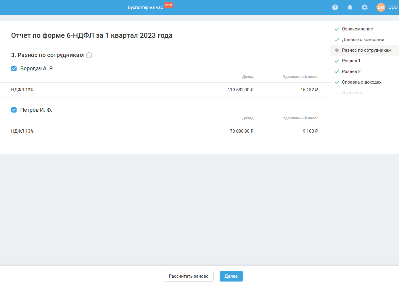 Если в момент прохождения мастера (до его завершения) вы вносили изменения в сервис, связанные с начислением и выплатой зарплаты, тогда для продолжения работы в мастере воспользуйтесь кнопкой «Рассчитать заново».