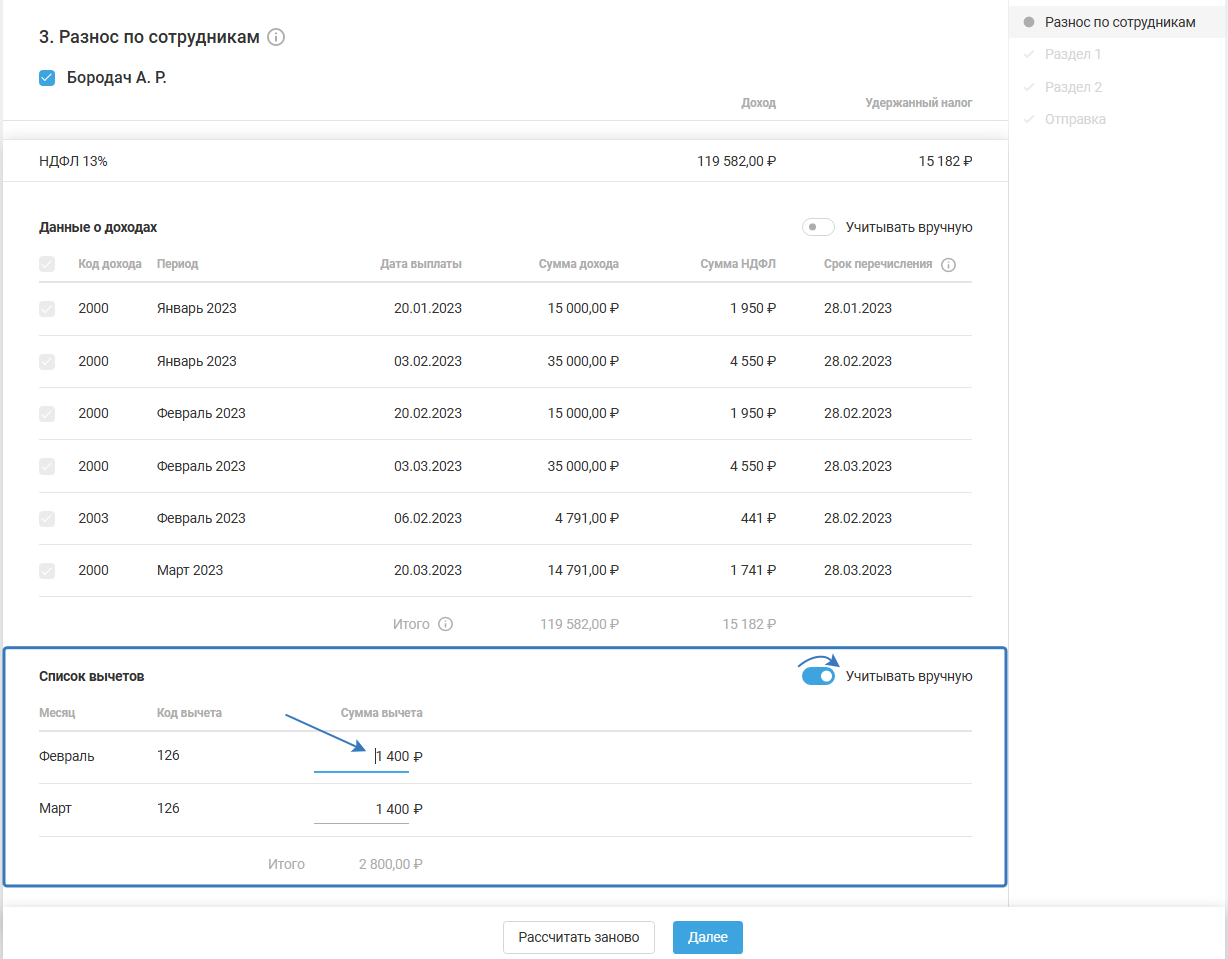 Для изменения данных о вычетах, также нажмите тумблер «Учитывать в ручную». Вы сможете отредактировать данные в поле «Сумма вычета»: