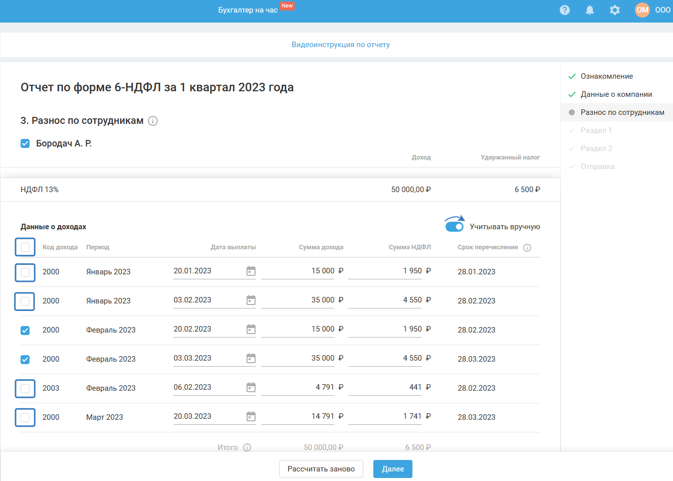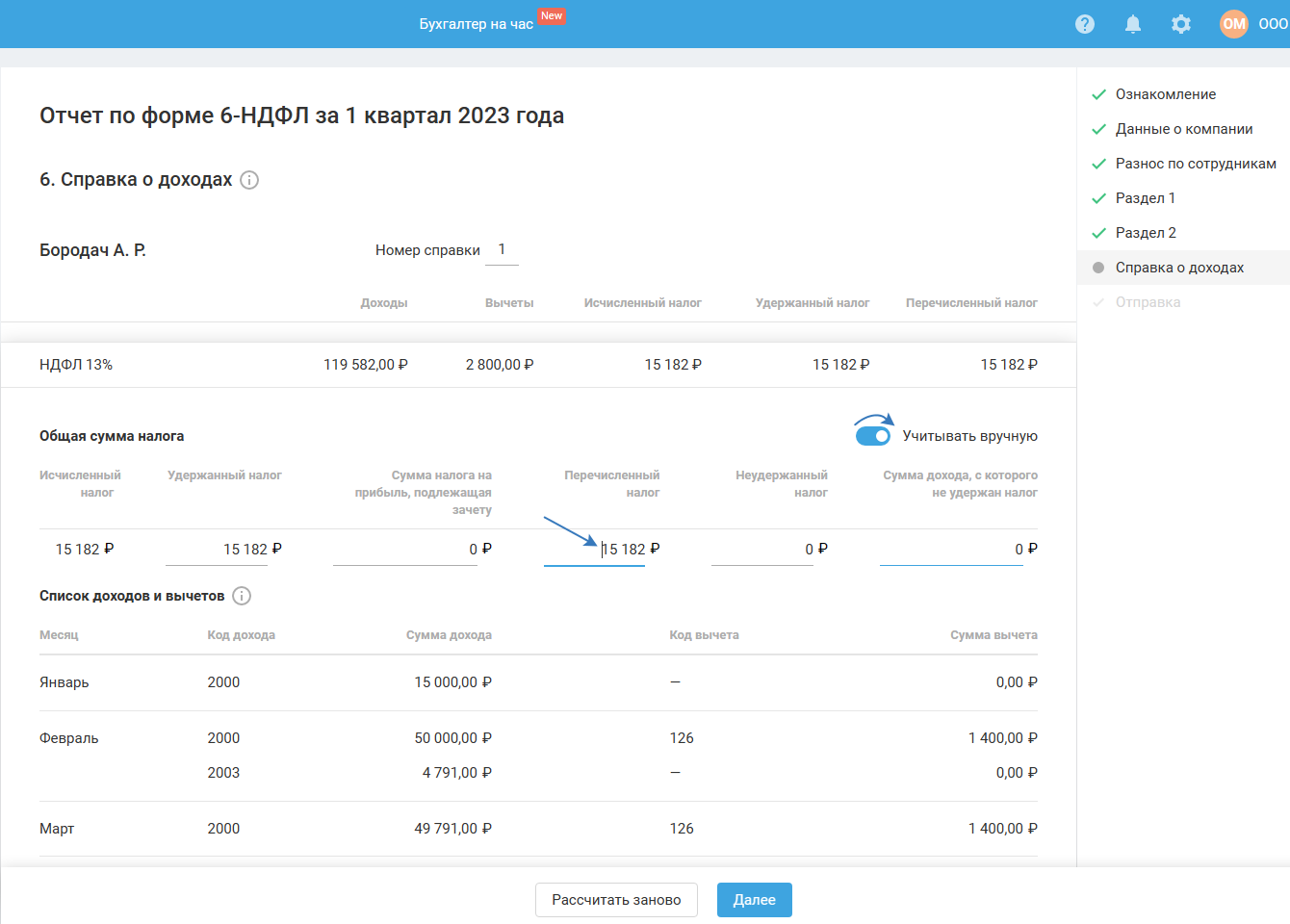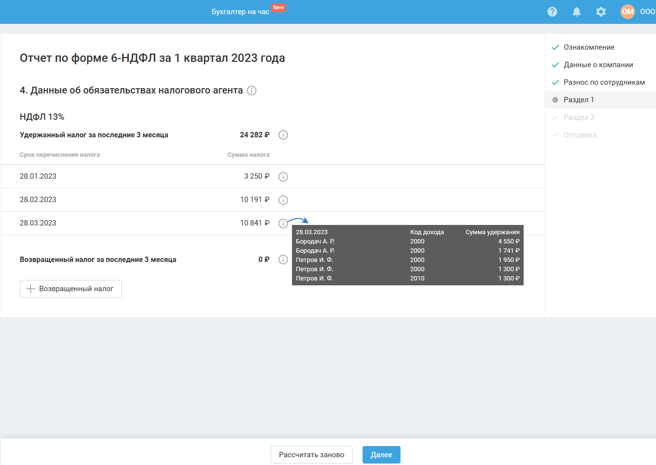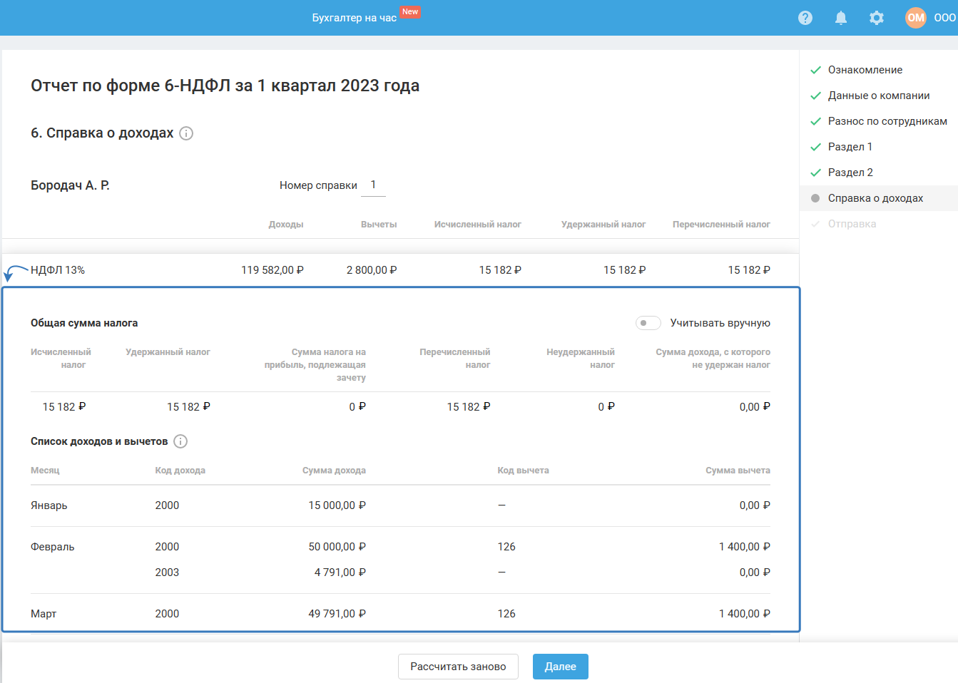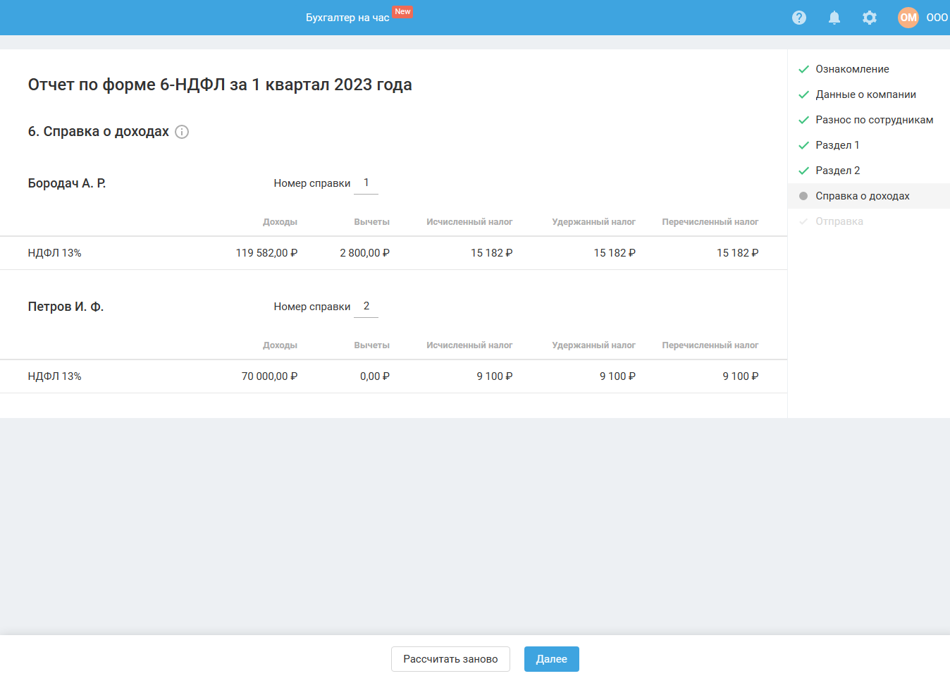 Данные, отображённые на этом шаге, являются вспомогательными для последующего заполнения разделов 1 и 2 расчёта 6-НДФЛ и справки о доходах. Справка о доходах формируется при формировании отчёта за год или в случае ликвидации (реорганизации) организации.
