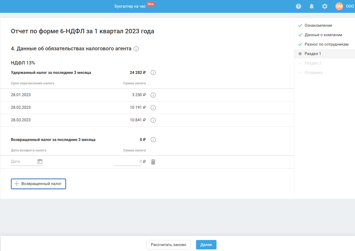 Если вы возвращали излишне удержанный НДФЛ сотруднику за последние 3 месяца отчётного периода, необходимо его добавить, нажав кнопку «+ Возвращённый налог»: